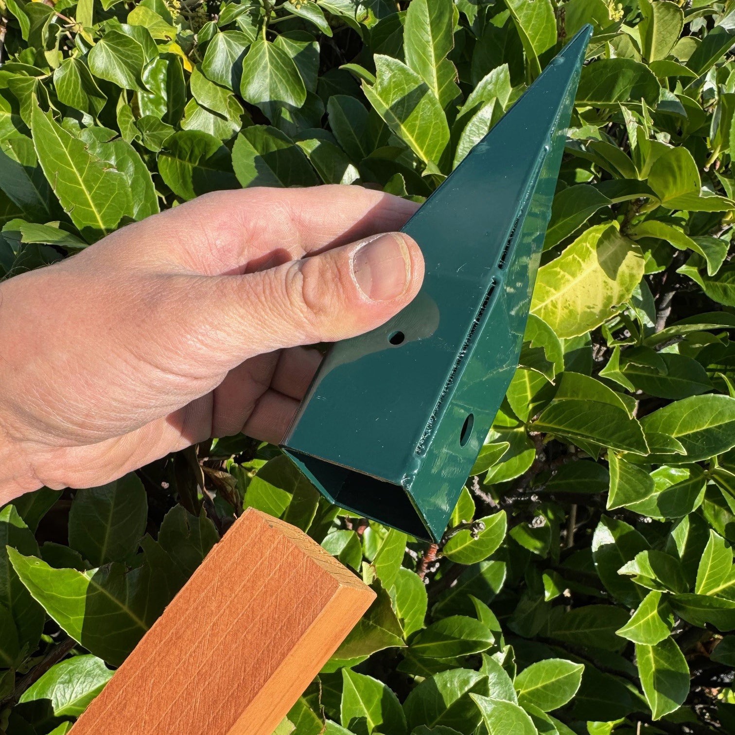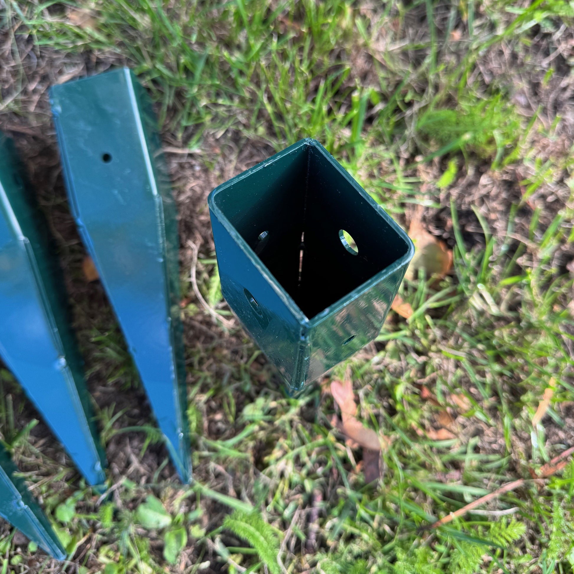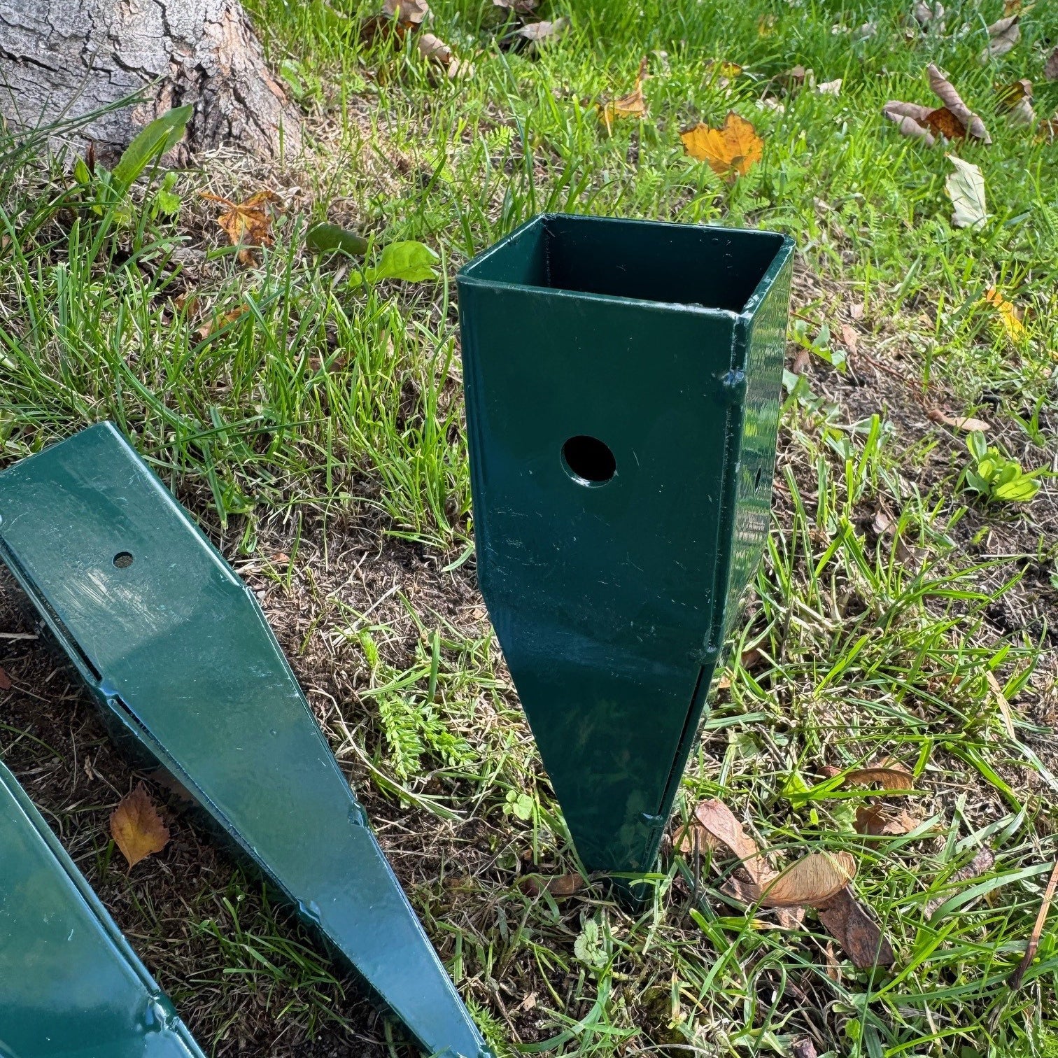 The spikes have an internal dimension of 4.5cm x 3.7cm x 6.5cm deep and are made from 2mm thick painted steel. They feature screw holes in the sides to allow the arches to be screwed to the spikes; this in turn will fasten the arch securely to the ground when positioned in place.
