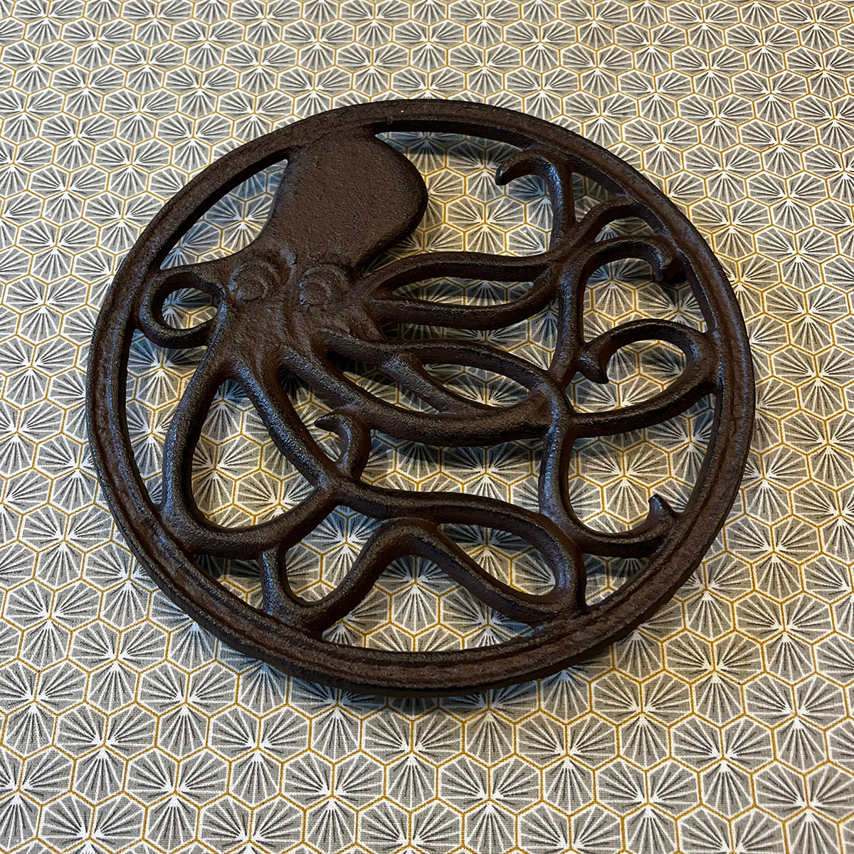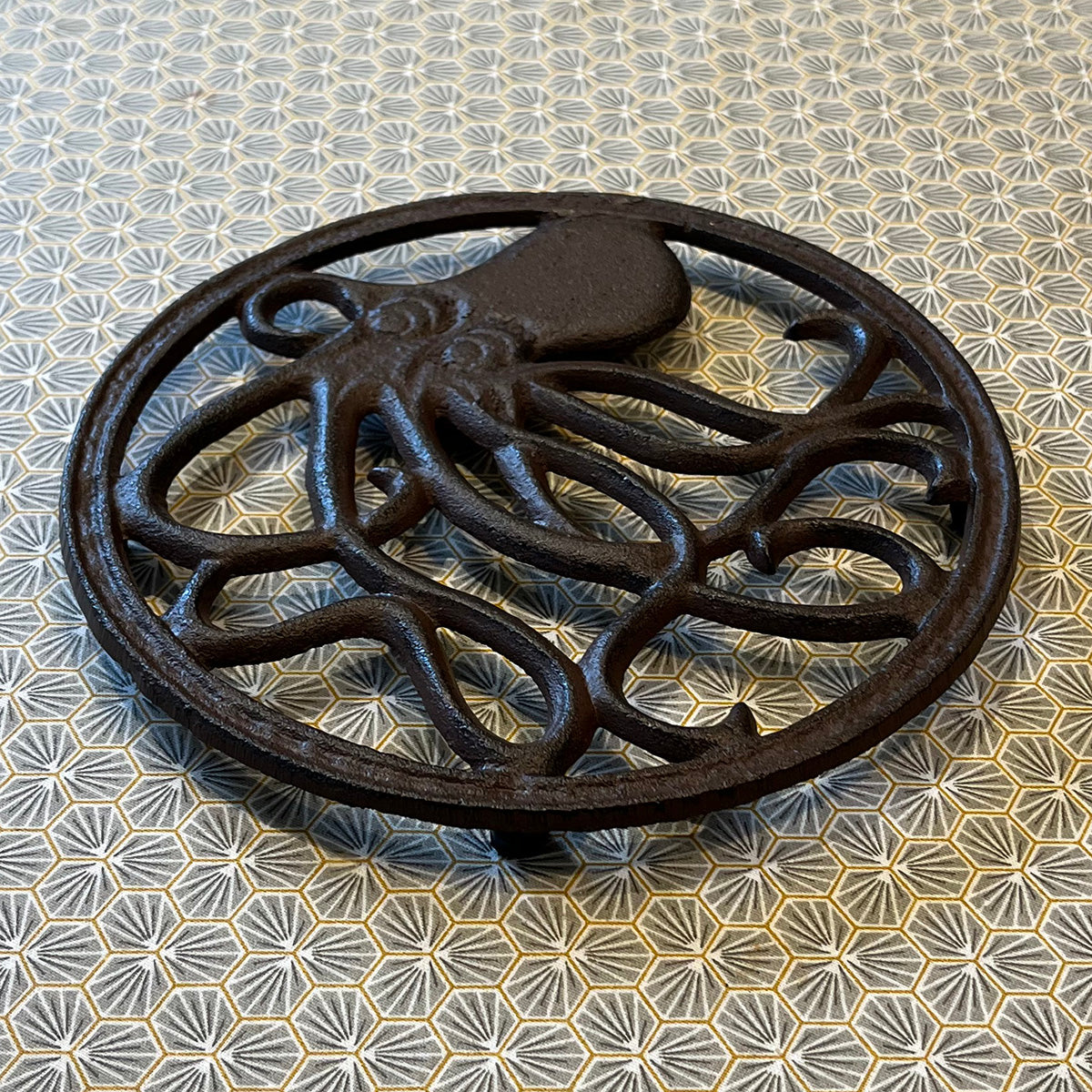 Made from cast iron, this trivet is the perfect place to put a hot sauce pan to keep it off a tabletop. A wide-eyed octopus decorates the internal ring of the trivet, whose trailing legs offer support to your cookware.