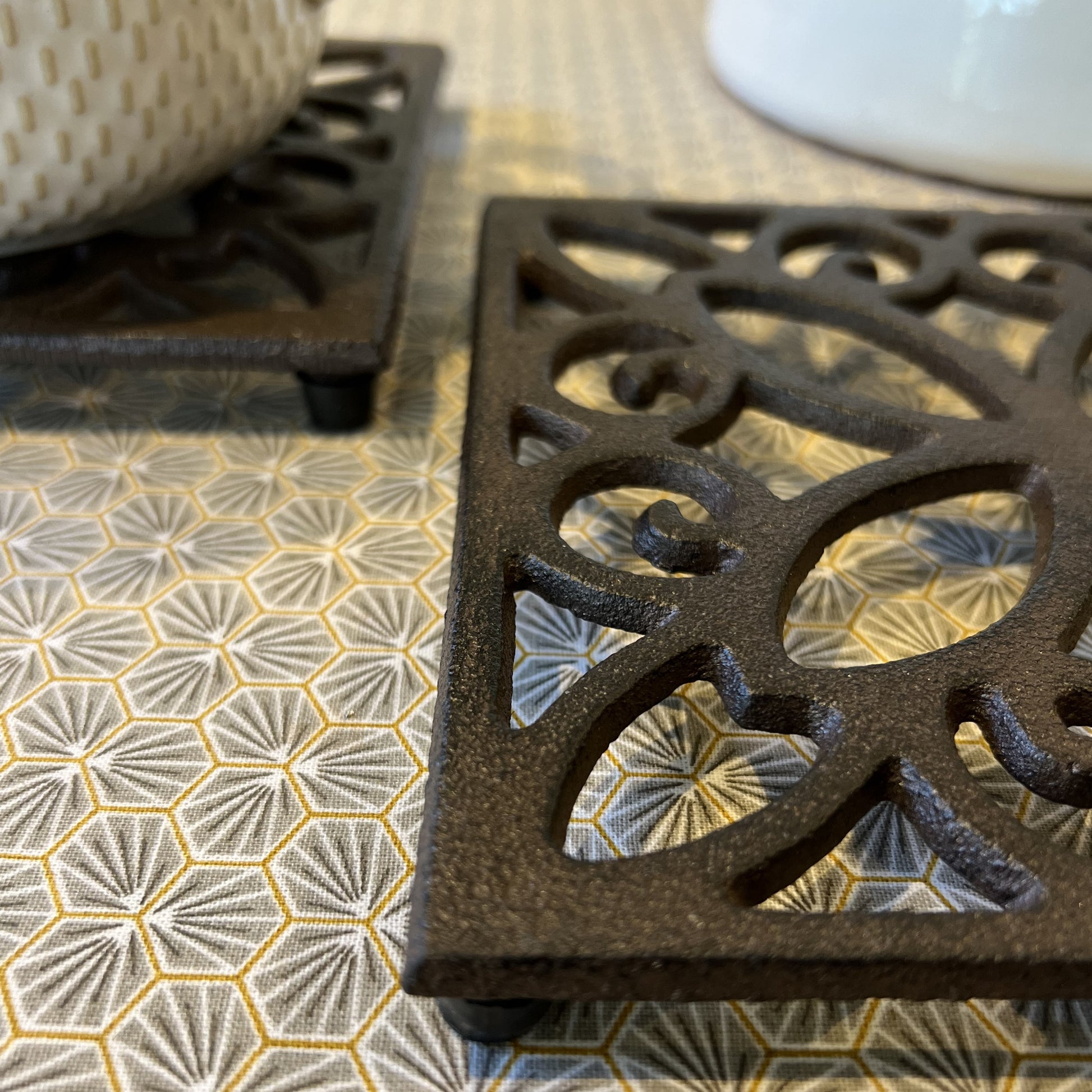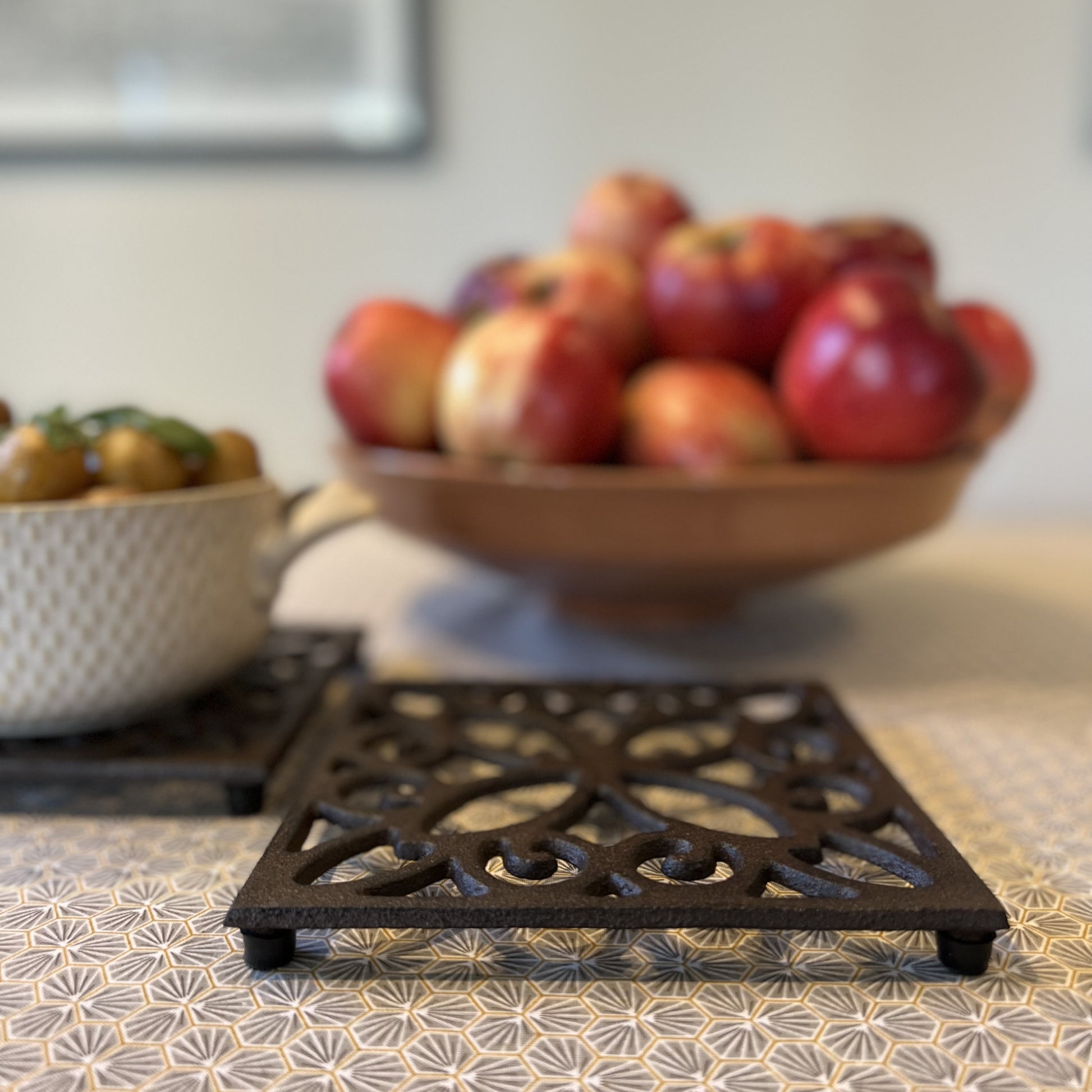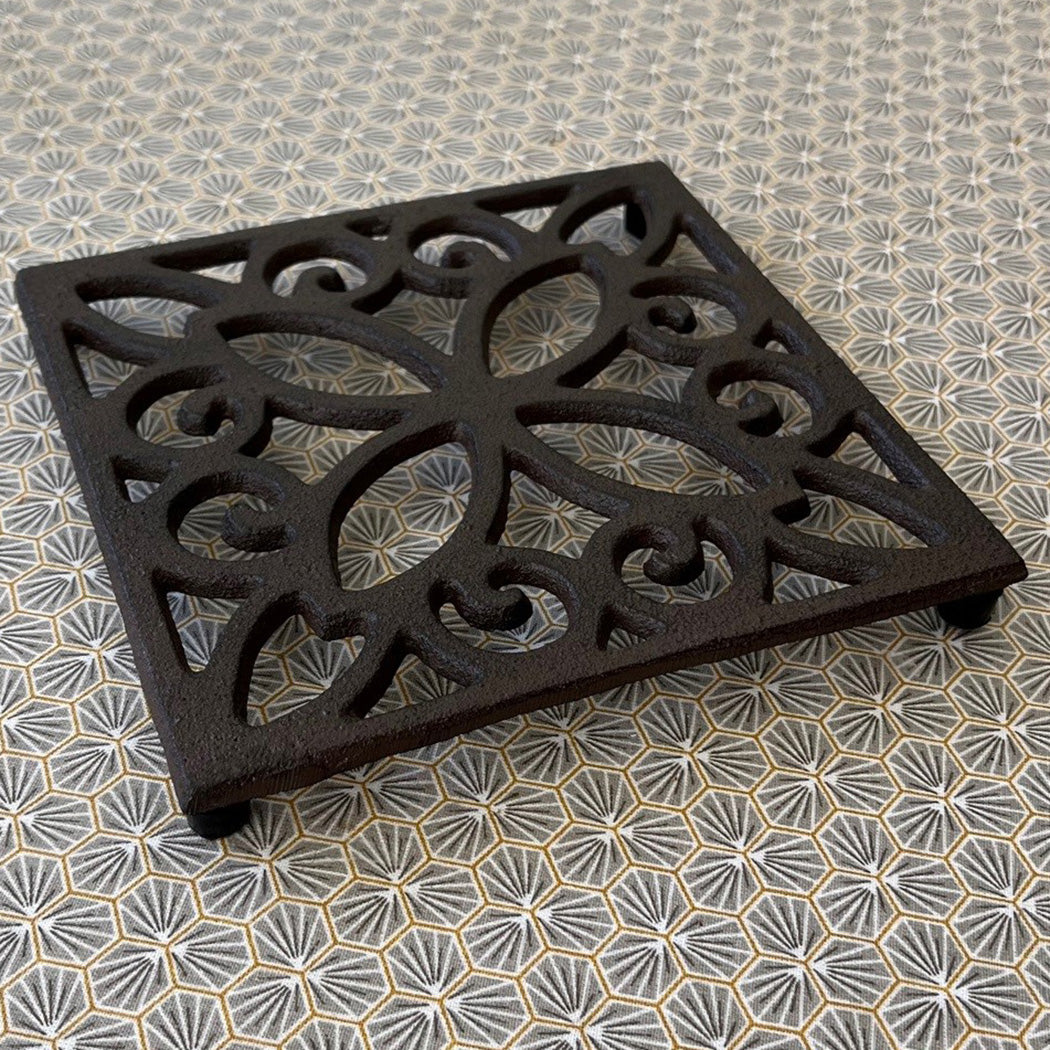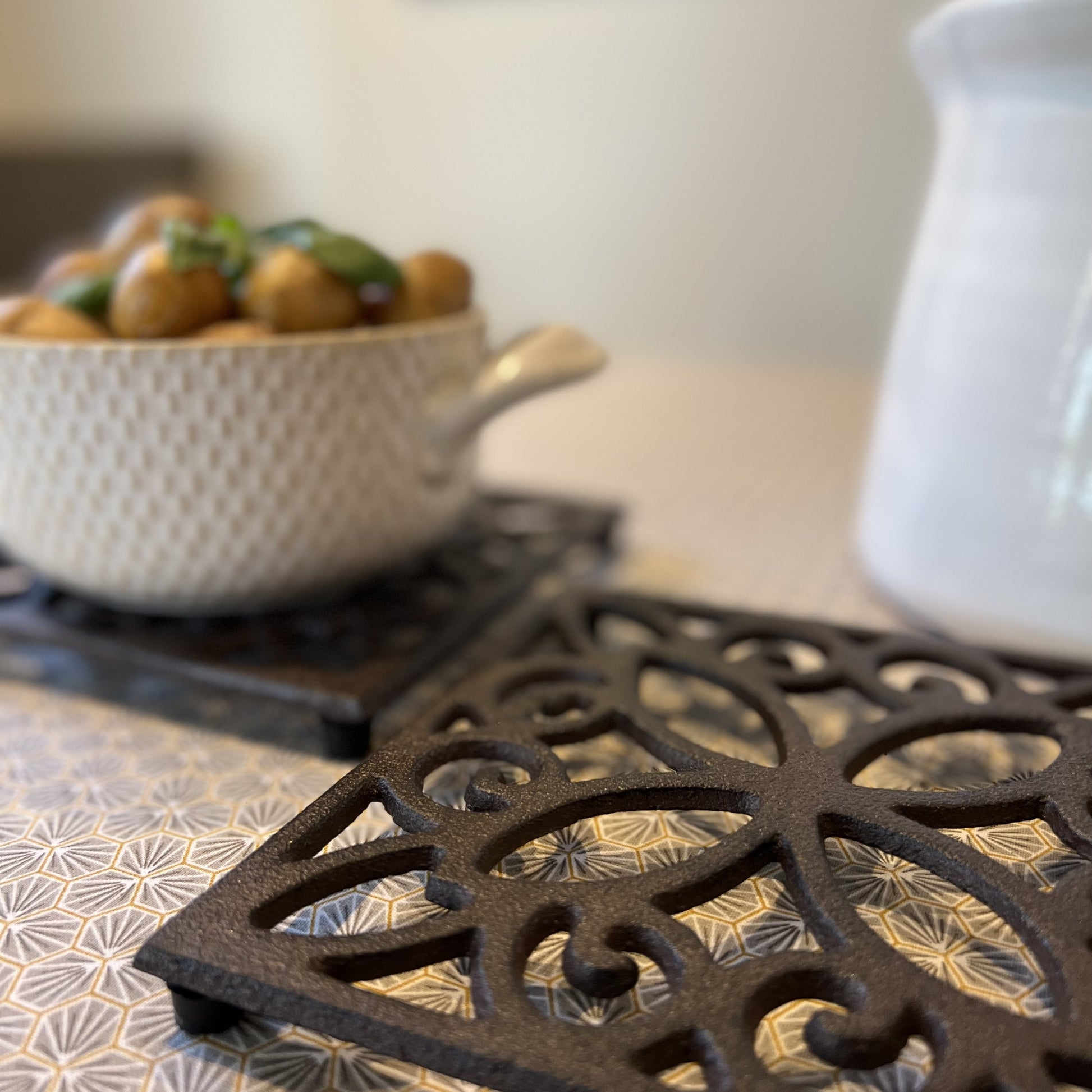 Made from cast iron in a vintage style, these trivets are the perfect place to put hot sauce pans to keep them off tabletops.