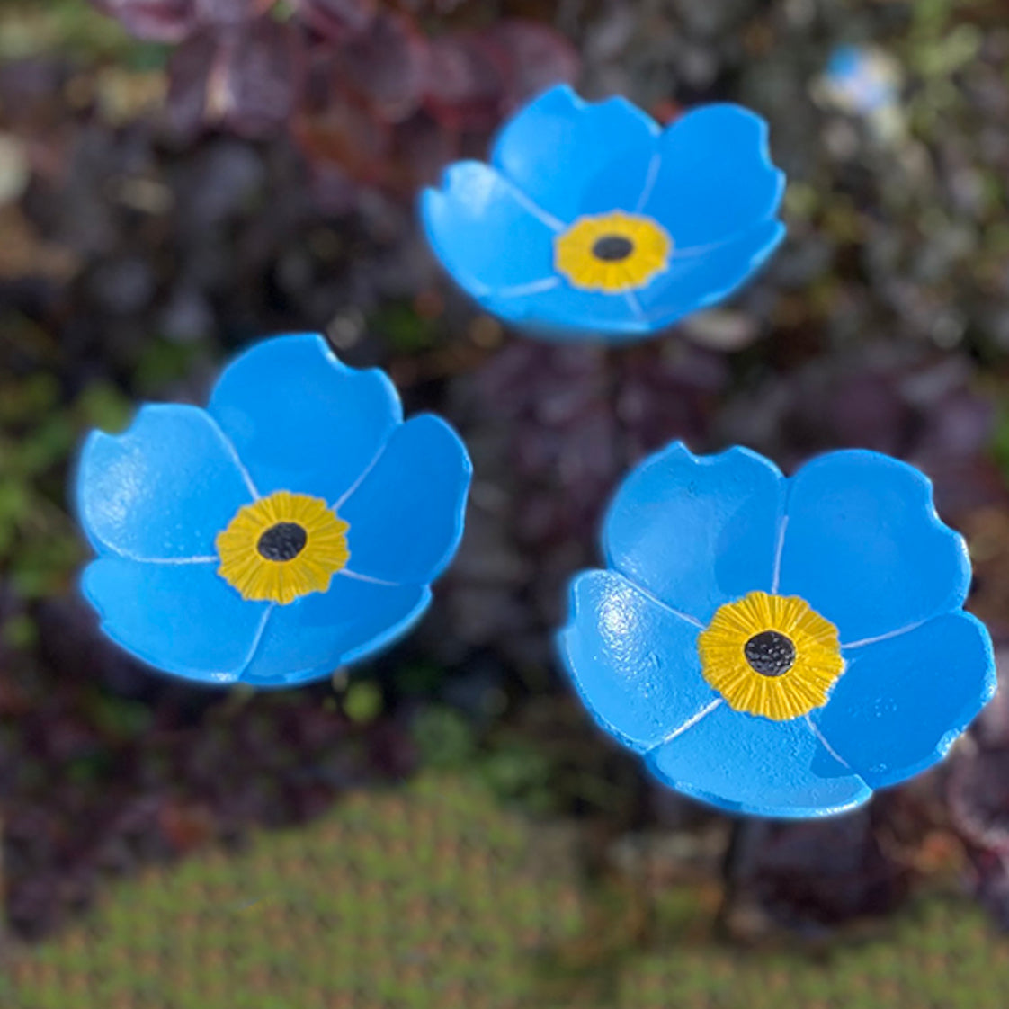 These decorative wild bird feeders feature painted steel poles with feeding dishes in the shape of vibrant Forget Me Not flowers. Practical and attractive, these lovely feeder dishes make lovely features for borders and pots. These free standing bird feeders are ideal for serving a range of bird foods including seed, nuts and mealworm.