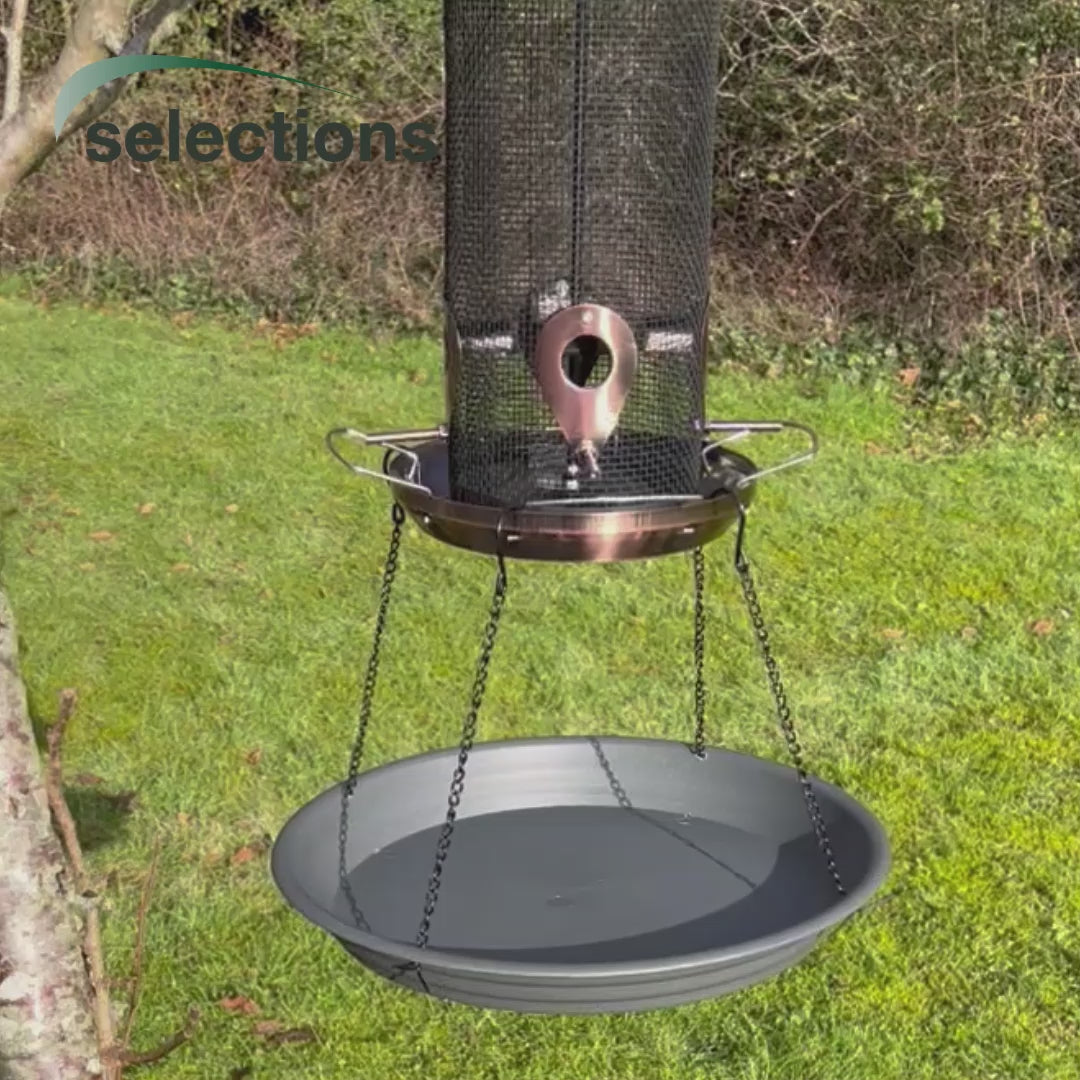 A beautiful looking bird feeder, with a lovely copper coloured top (this is made from electro plated metal - so hardwearing as well as attractive). Coming with 4 feeding ports, the feeder measures 35cm high and 19cm wide, and comes with a large hanging hook. Also included is a large seed catcher tray - this plastic tray will catch all the seeds and seed casings that are discarded or dropped as the birds feed. Helping to keep lawns or flowerbeds clear of debris, the tray also acts as a secondary feeding platform for birds. There are 4 small holes at the edge of the base to allow for water drainage.
