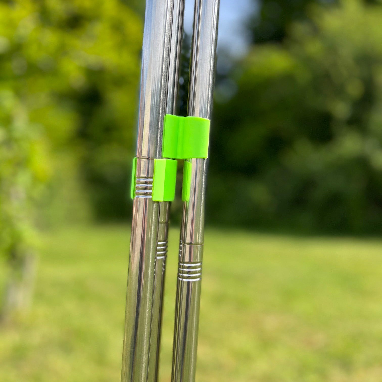 Easy to use, the handles screw together and then clip into the base. Included is a rake, a spade and a tray, all with long handles. There are 2 clips to keep the set together - ready for use when nature calls.
