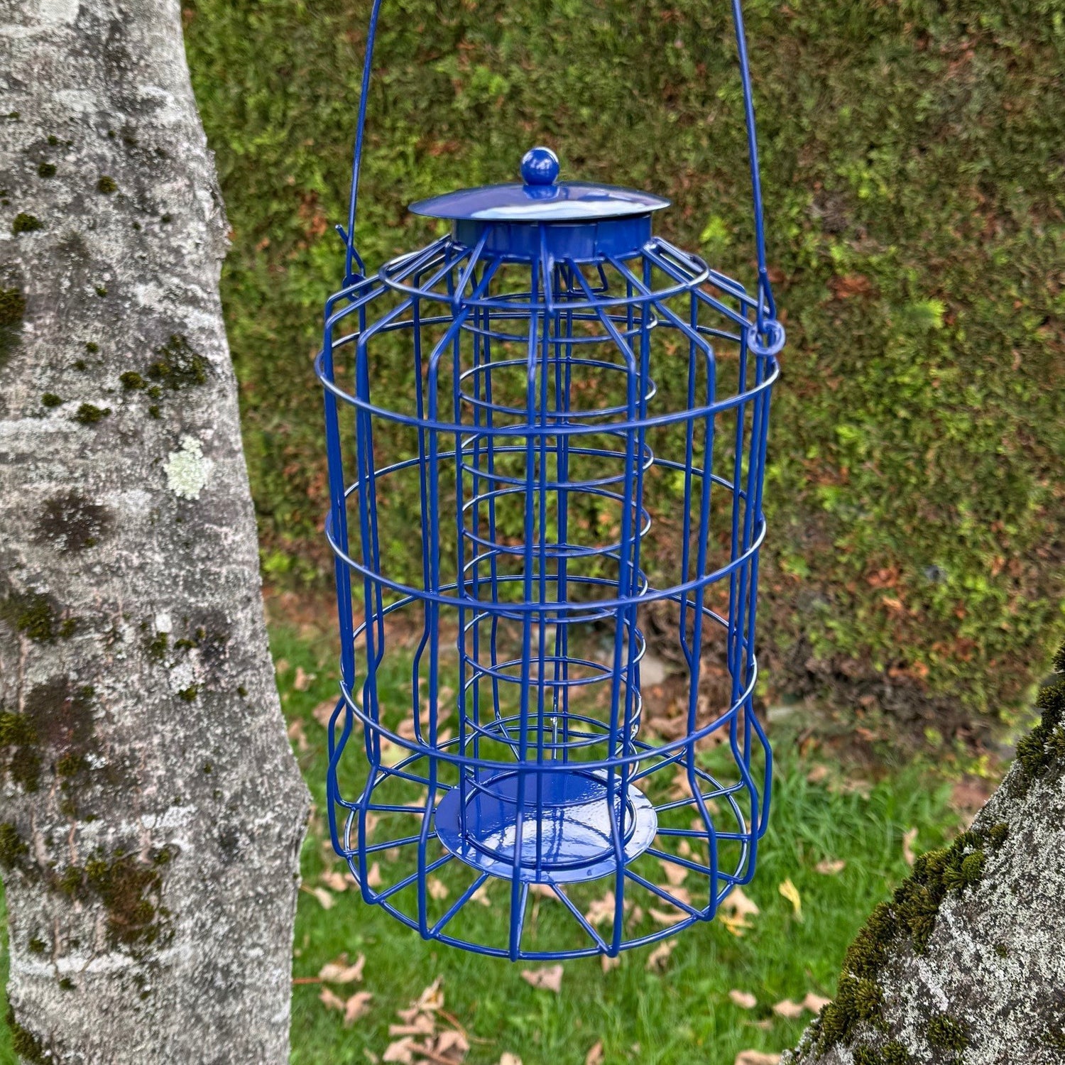 A large and attractive metal squirrel proof suet fatball bird feeder, designed to keep unwanted visitors out, but let the garden birds in. The feeder is surrounded by an anti-squirrel cage to protect the feed from unwanted garden pests.