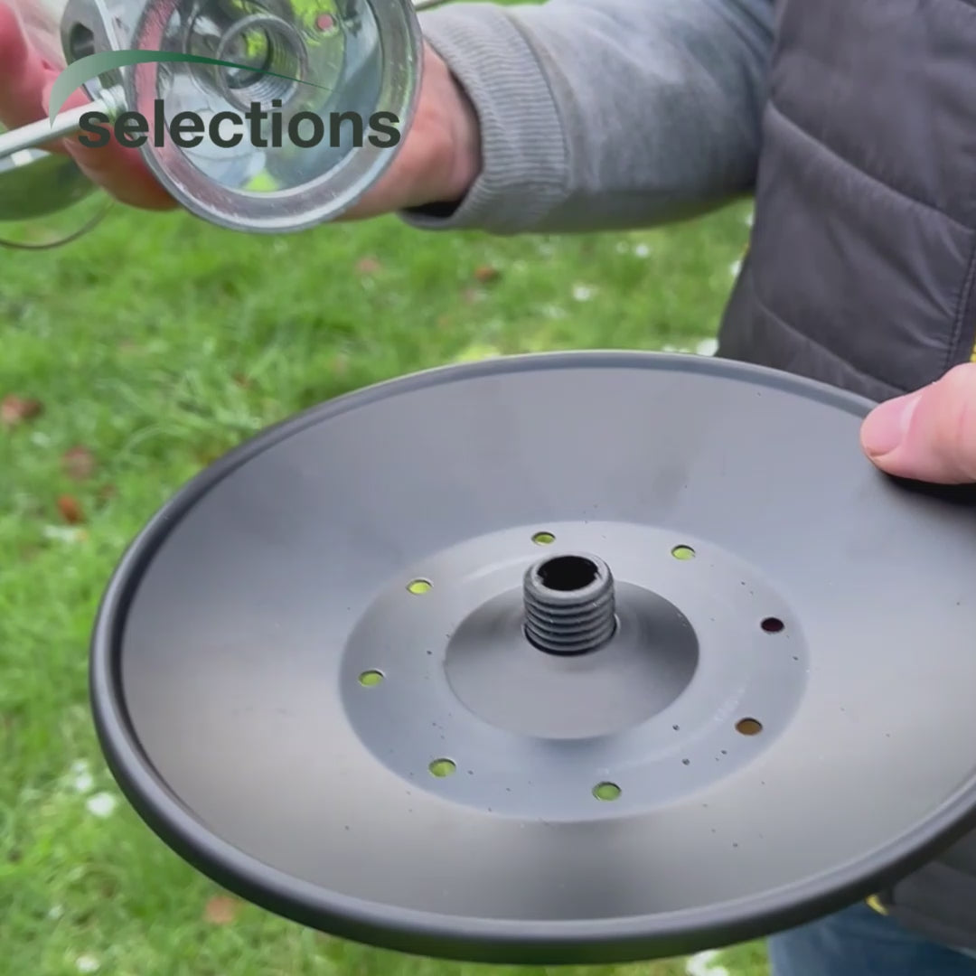 The 20cm seed catching tray simply screws to the bottom of this high-quality aluminium feeder, catching debris and acting as a secondary feeding platform for the birds to feed from.