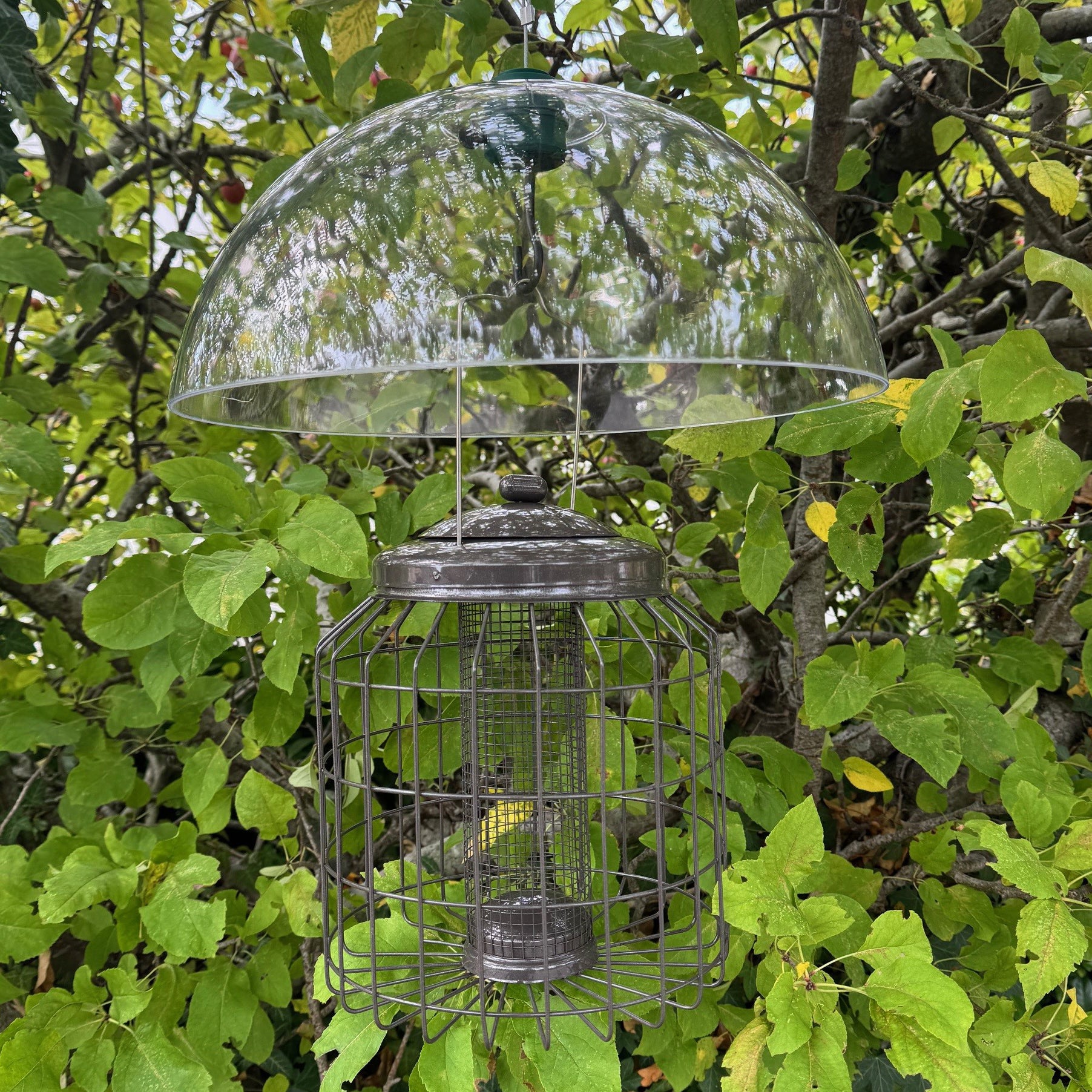This high quality heavy duty squirrel proof bird nut feeder is designed to exclude squirrels and large birds (such as Pigeons) from monopolising all of the tasty treats you leave out. A second layer of squirrel protection comes in the form of a plastic baffle that the feeder hangs from. The smooth dome surface provides no grip for squirrels and the clear finish means your view of the feeding birds is unimpeded.