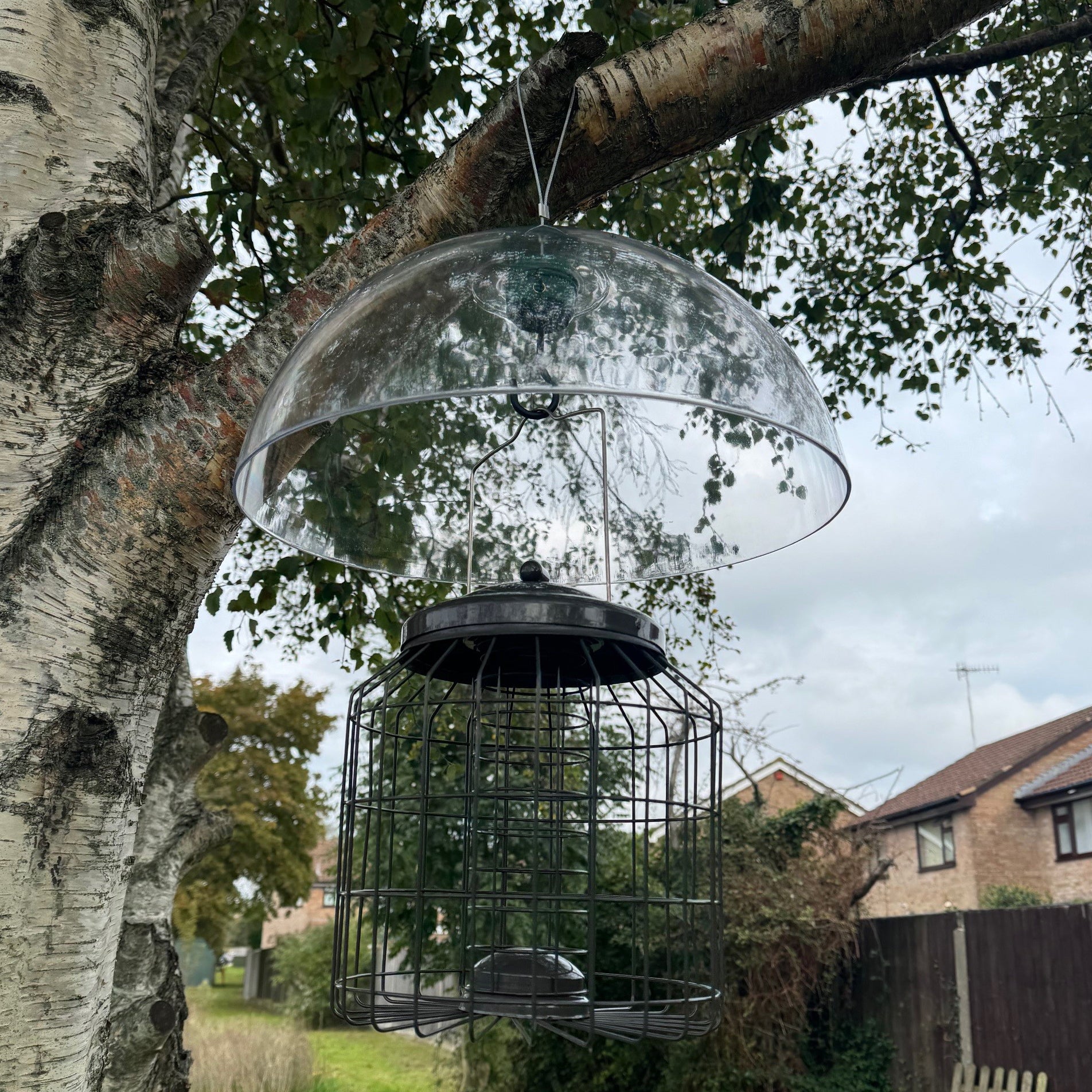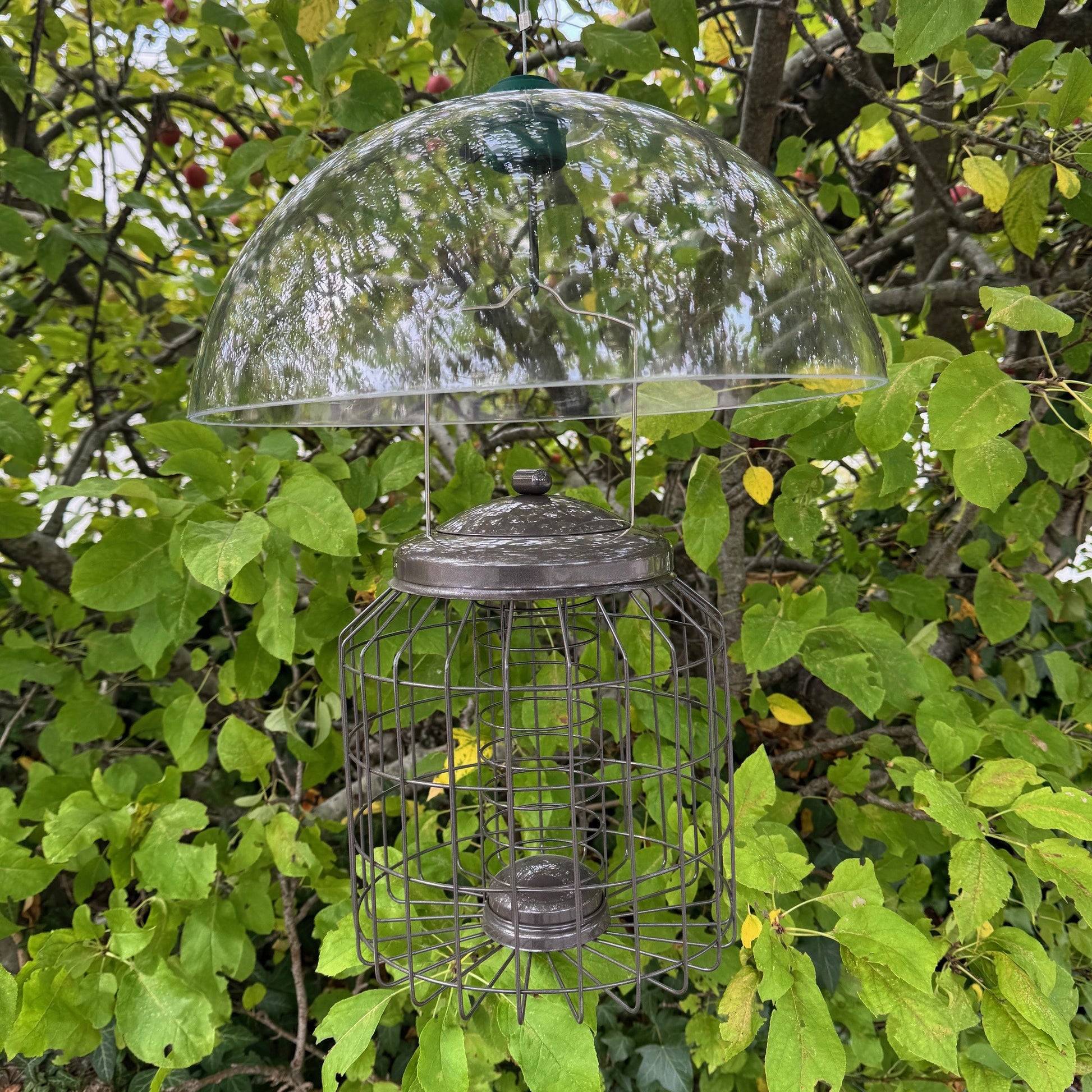 This high quality heavy duty squirrel proof suet fat ball bird feeder is designed to exclude squirrels and large birds (such as Pigeons) from monopolising all of the tasty treats you leave out. A second layer of squirrel protection comes in the form of a plastic baffle that the feeder hangs from. The smooth dome surface provides no grip for squirrels and the clear finish means your view of the feeding birds is unimpeded.