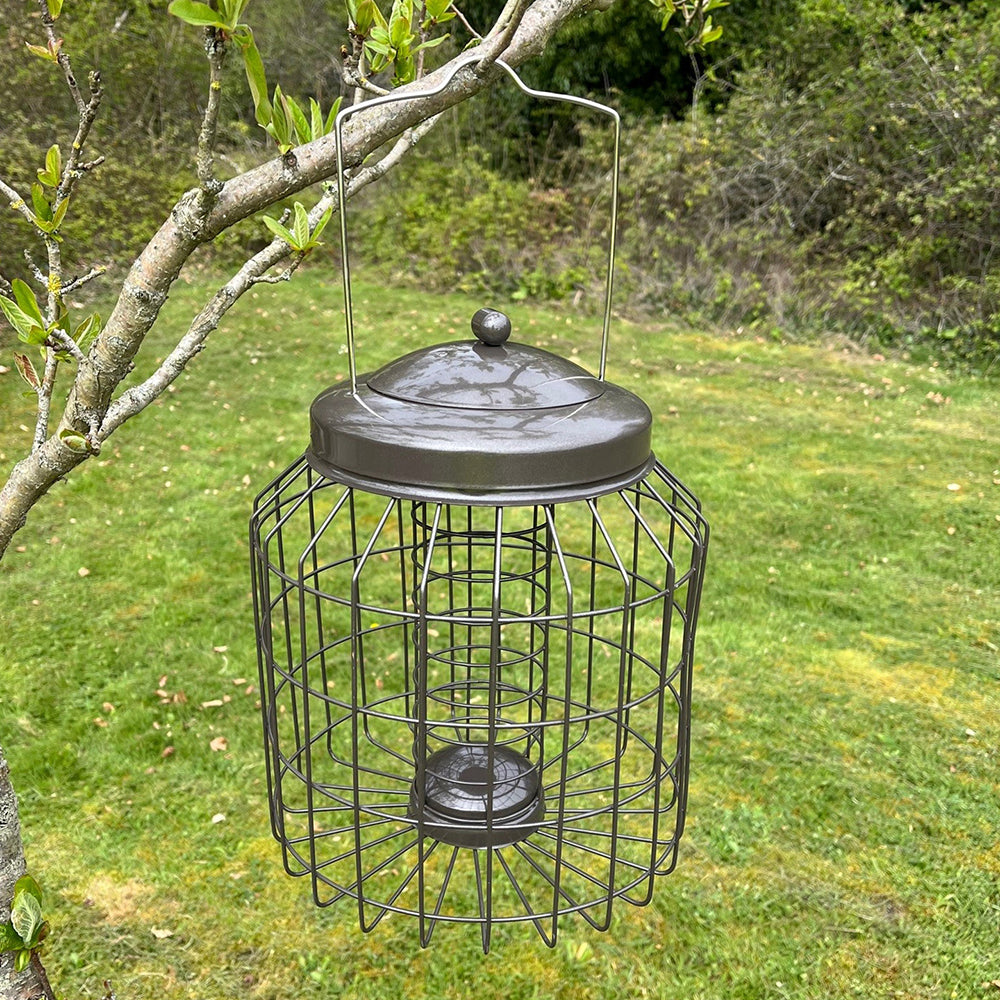 Finished in an attractive gun metal grey, the feeder is heavy duty and built to withstand the elements. The lid is opened with a 'twist and lift' mechanism, and the large hanging hook measures 17cm x 14cm (this retracts into the feeder body when not in use).