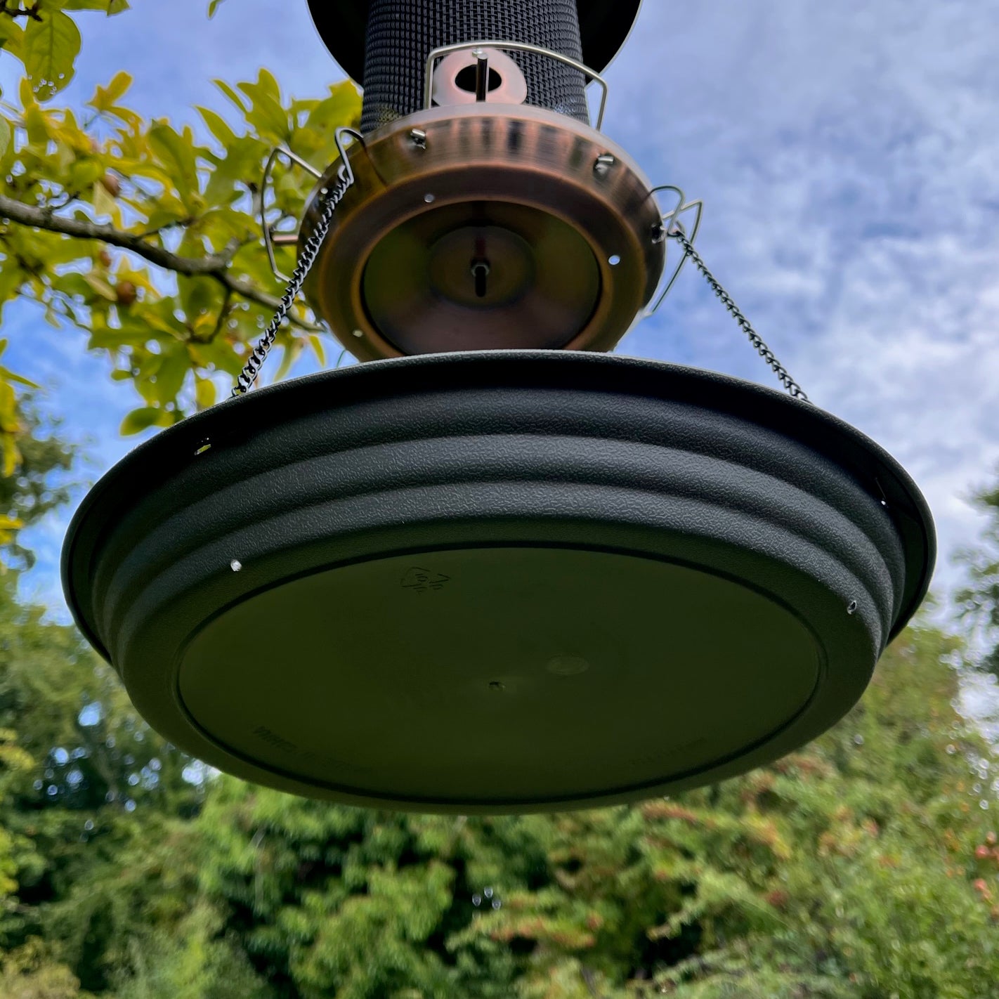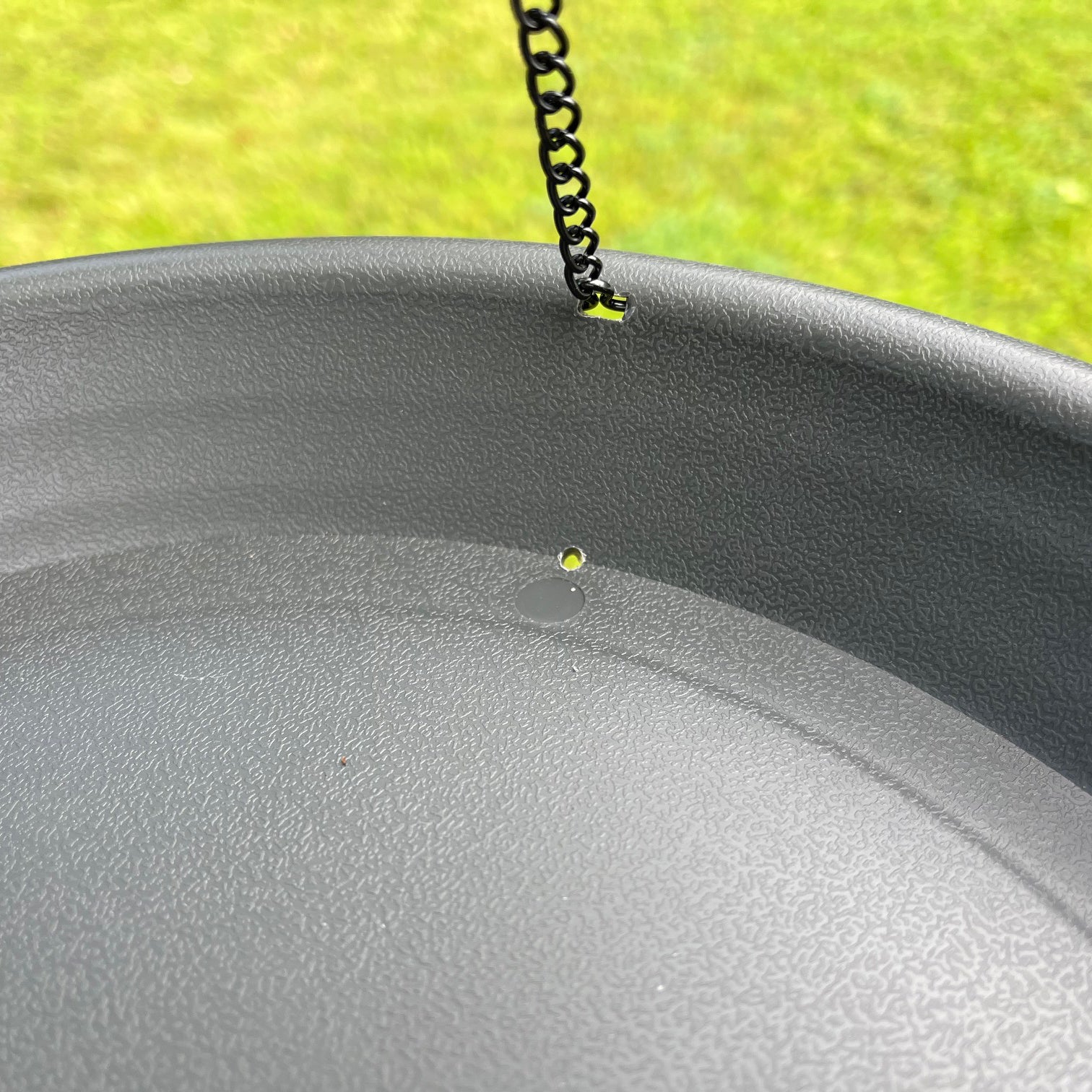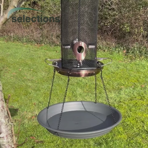 Attaching to the bottom of a large seed feeder by means of 4 hanging chains, this plastic tray will catch all the seeds and seed casings that are discarded or dropped as the birds feed. Helping to keep lawns or flowerbeds clear of debris, the tray also acts as a secondary feeding platform for birds. There are 4 small holes at the edge of the base to allow for water drainage.