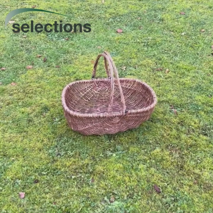 Collect your produce in a touch of rustic style with this beautiful large wicker garden trug. Measuring 52cm long and 41cm wide, strands of willow are woven together to create a strong basket, perfect for gathering and displaying your harvest. The trug stands 18cm tall with the handles adding another 24cm when upright.