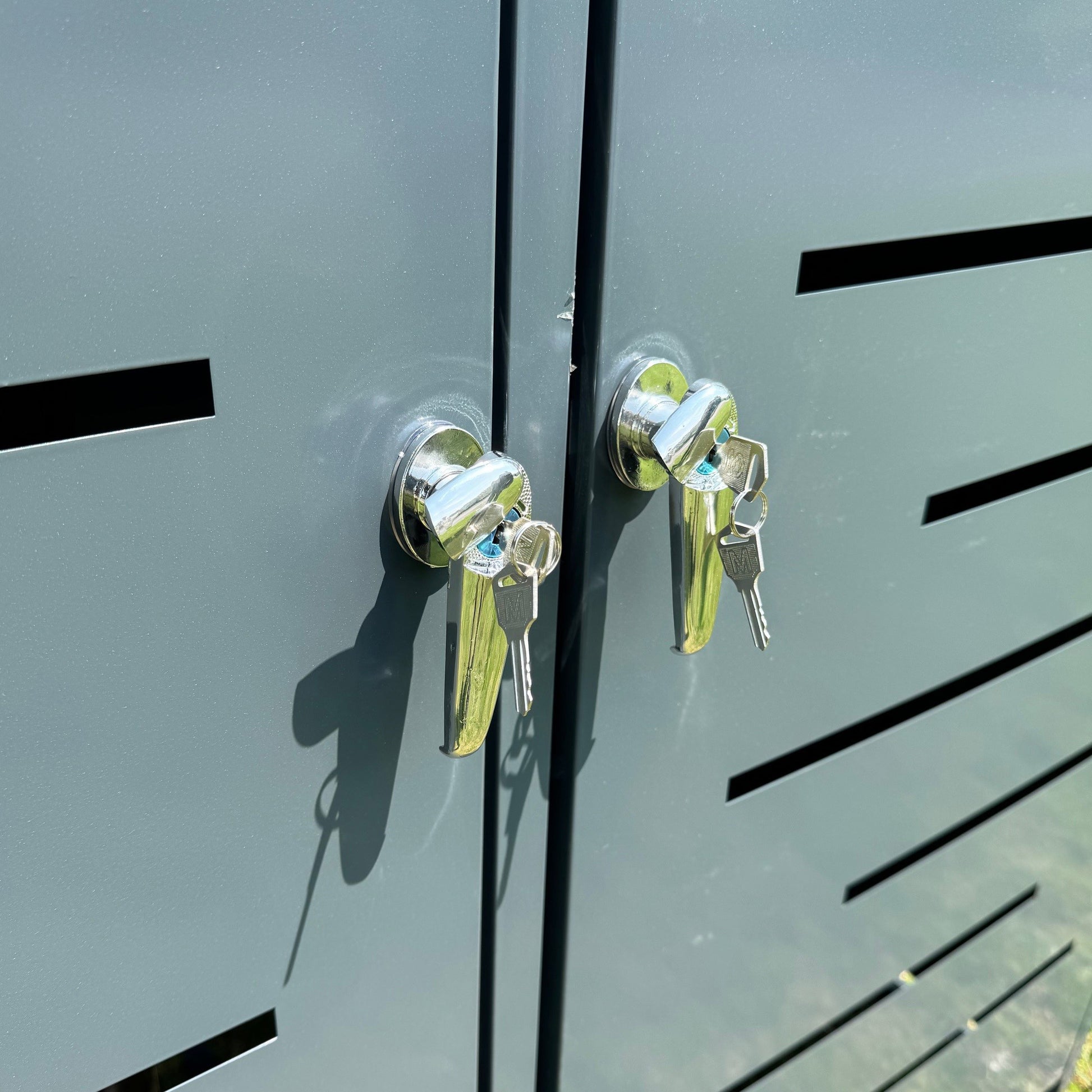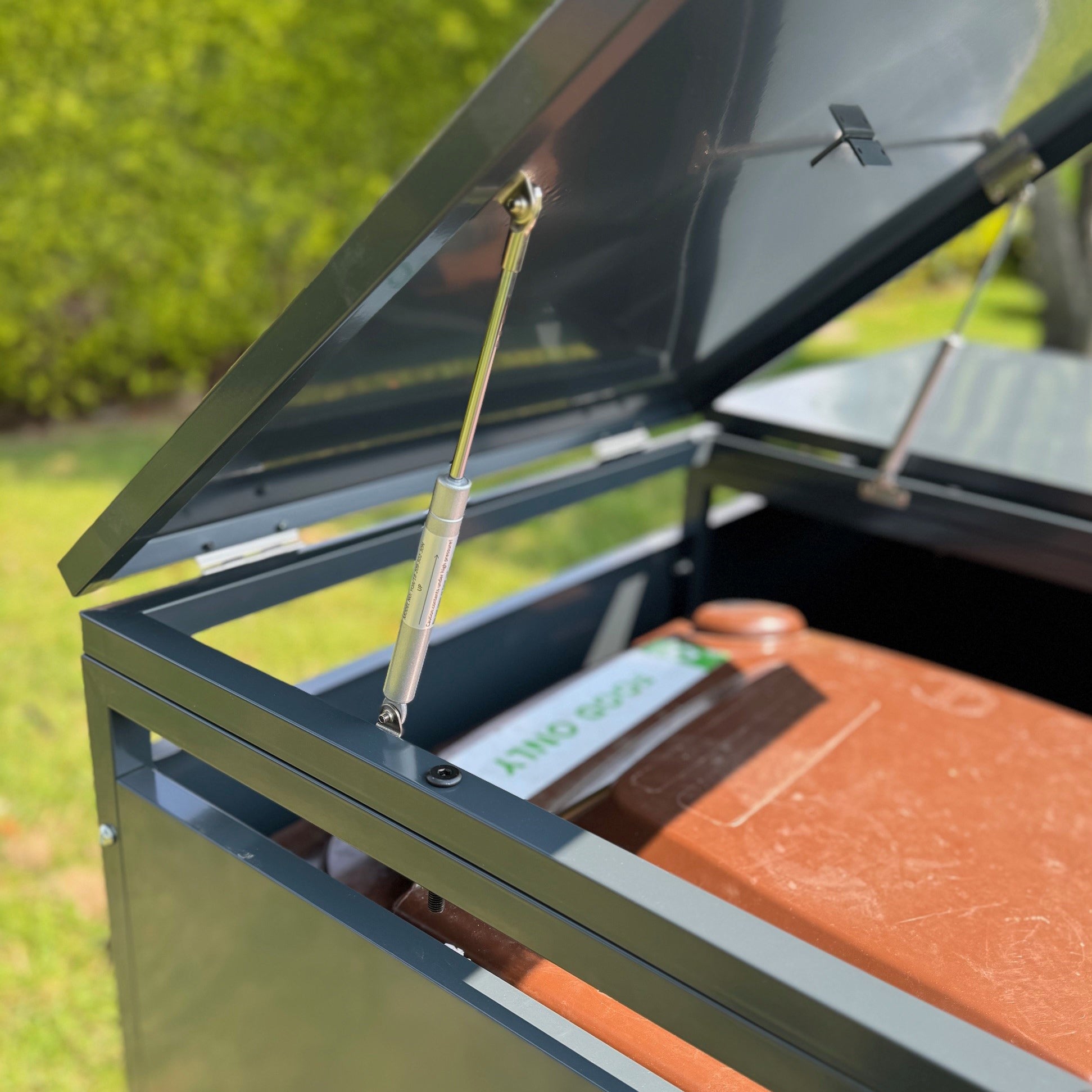 Finished in a beautiful painted dark grey, this storage unit will blend in with any outdoor setting, at once subtle and practical. Each door panel opens independently, and can be locked for extra security, with a key per door being provided; excellent for deterring any unwanted garden visitors. The lids open separately as well, and the hydraulic supports keep them open, meaning you don't need three hands to attend to your refuse - you can simply close the lid when you're ready. Cord is included, that can be tied from the store lid to the lid of your bin, meaning that both can open at the same time, again easing the struggle when laden with rubbish bags.