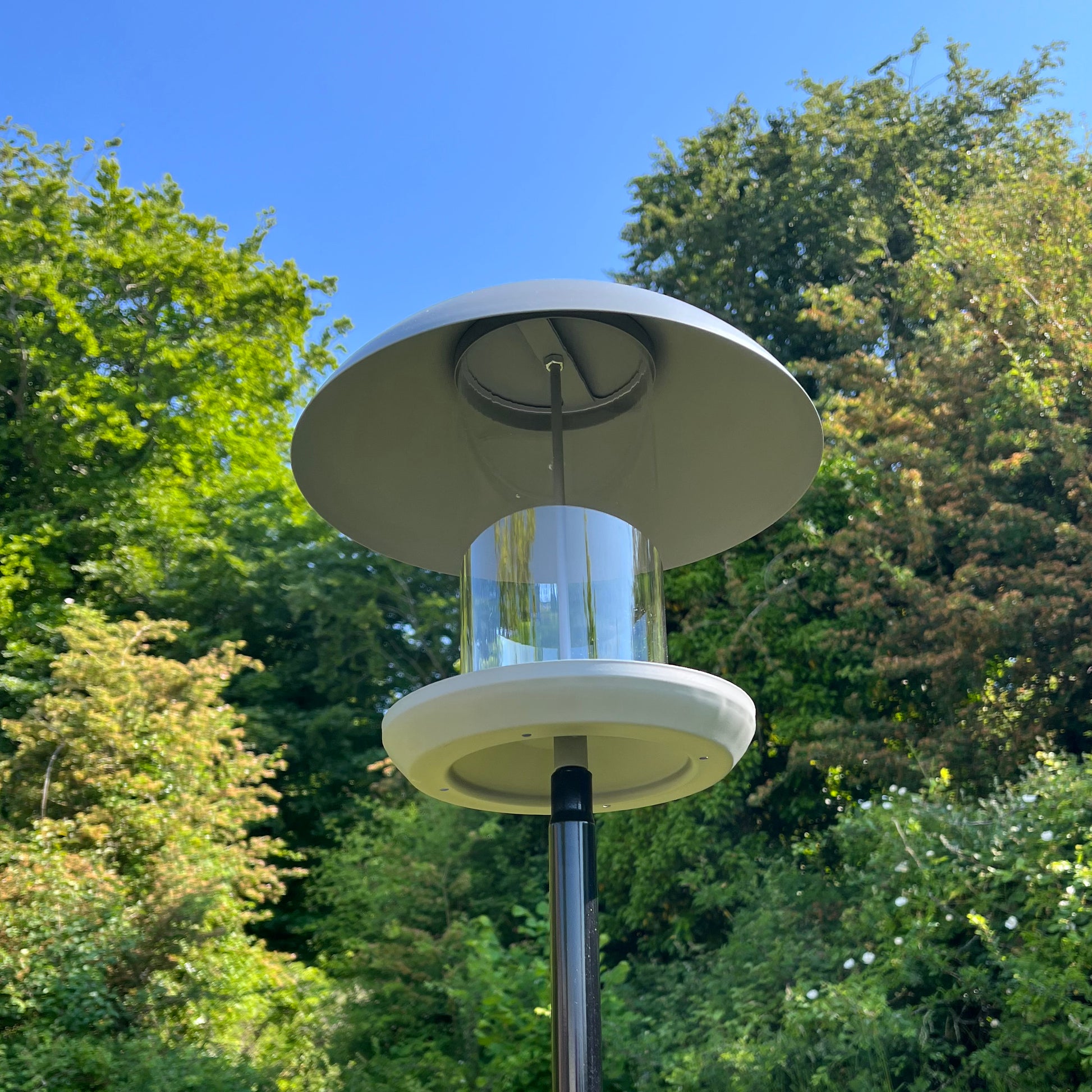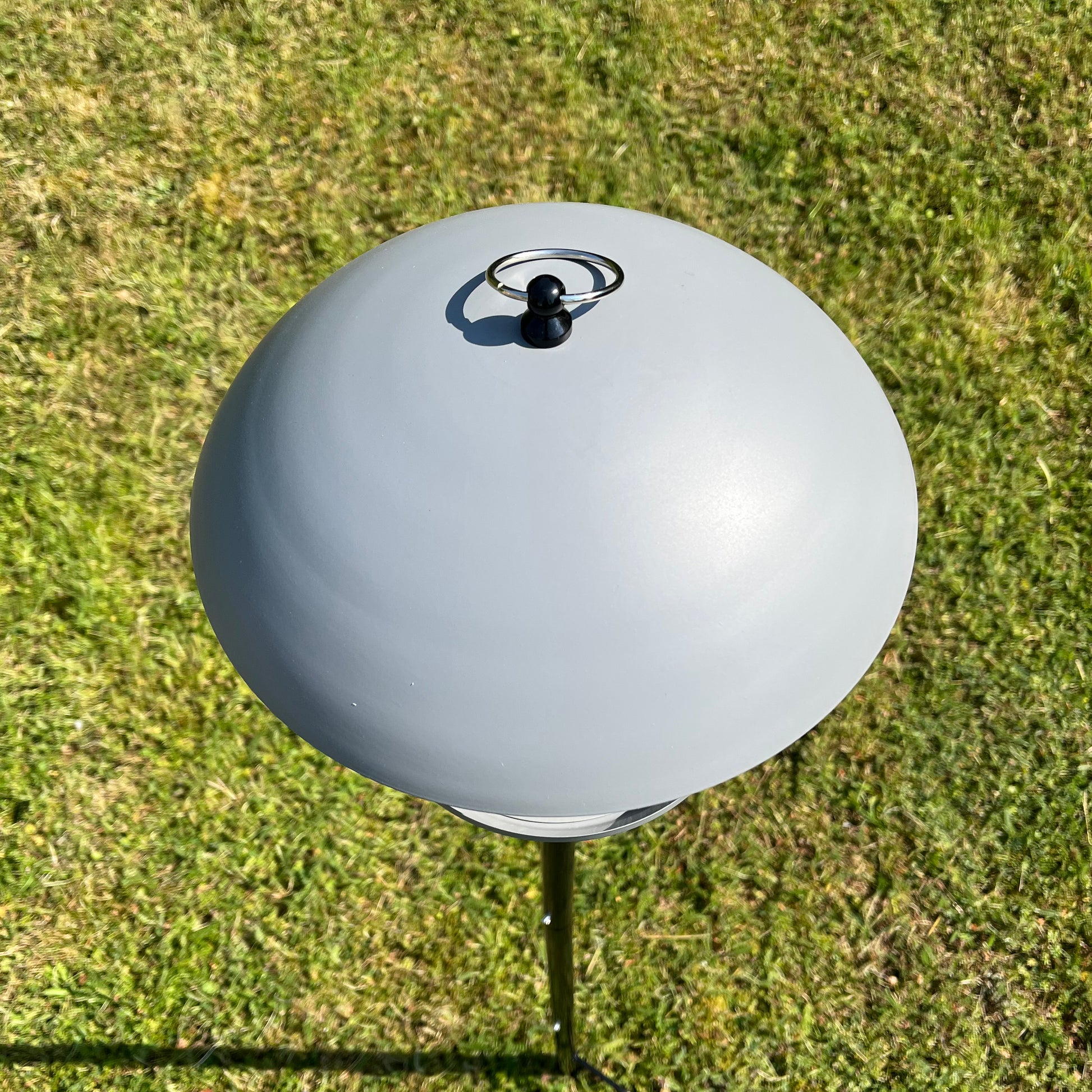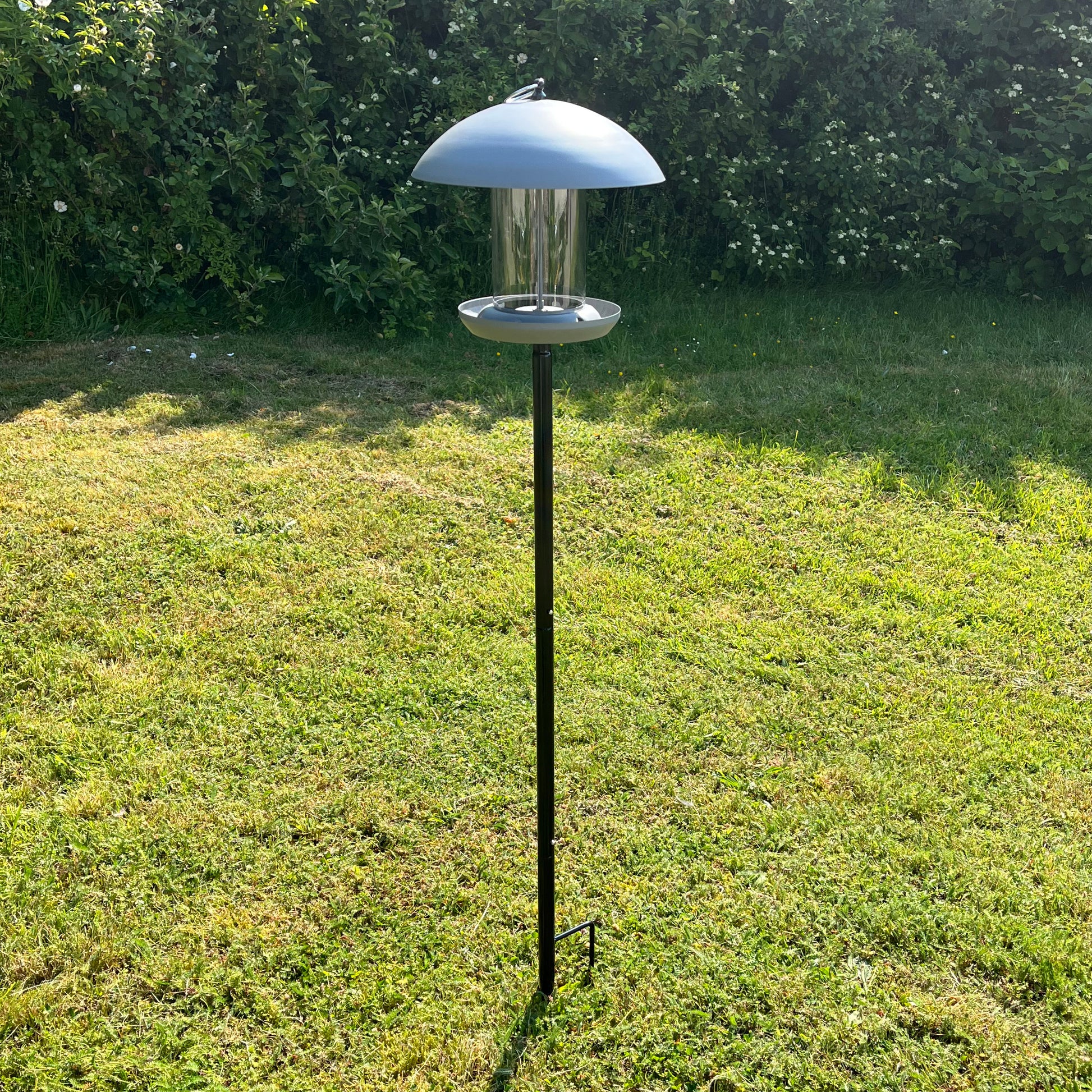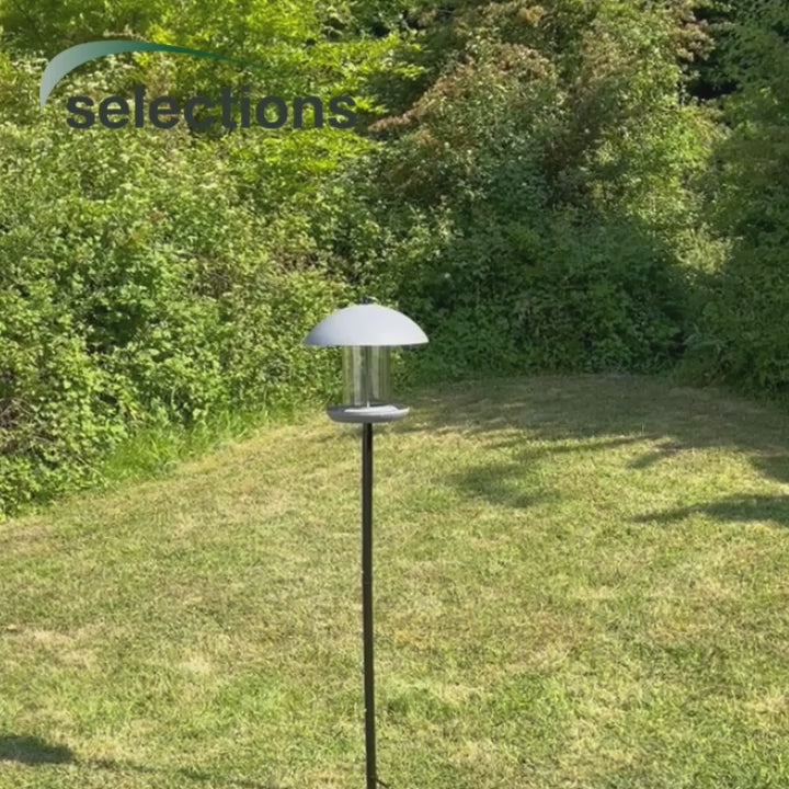 The smooth curves of this more unusual free standing bird feeder table, along with the subtle grey finish, mean that it will sit prettily in any outdoor space. The dome and the perch are both made from metal, sandwiching a plastic tube that holds the bird treats. The feeder screws into a 1m tall mounting pole (including spike) that simply pushes into the ground for installation.