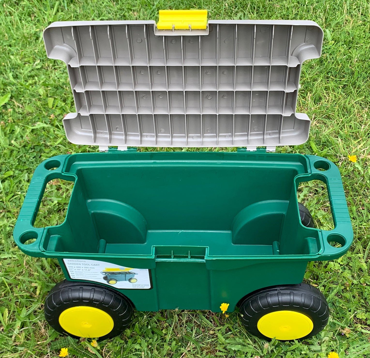 Made from durable plastic, the seat pad measures 38cm long by 24cm deep. The flip top lid opens and reveals a removable tray with 6 compartments, and under that a deeper trench for storing those tools.