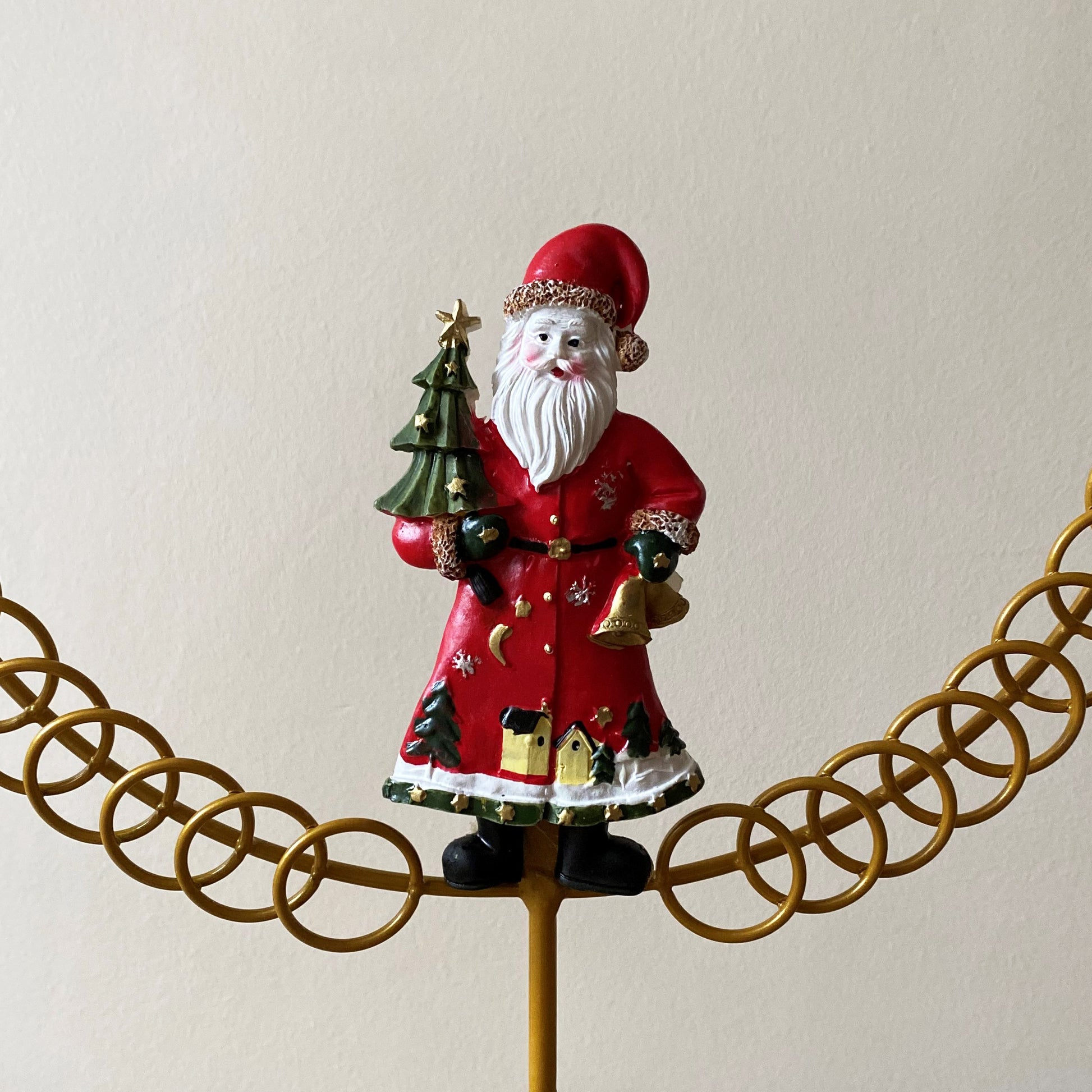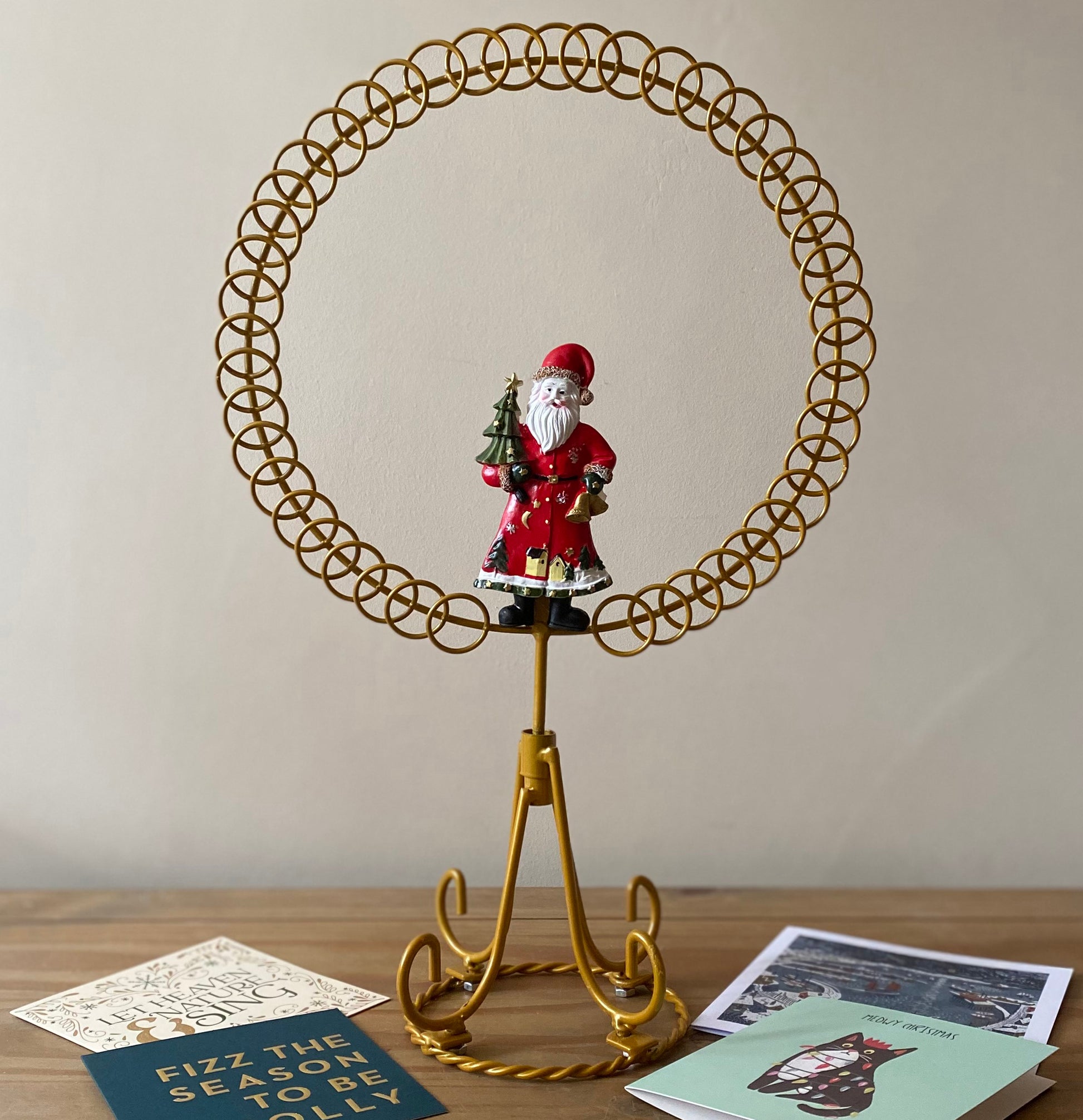 Finished in a subtle gold, the card holder encircles a hand painted, traditionally styled Father Christmas holding a Christmas tree and golden bell. The base is finished in a matching gold and features a delicate rope effect with curved feet for an elegant finish. This festive card holder is sure to become a firm favourite in your Christmas decoration collection.