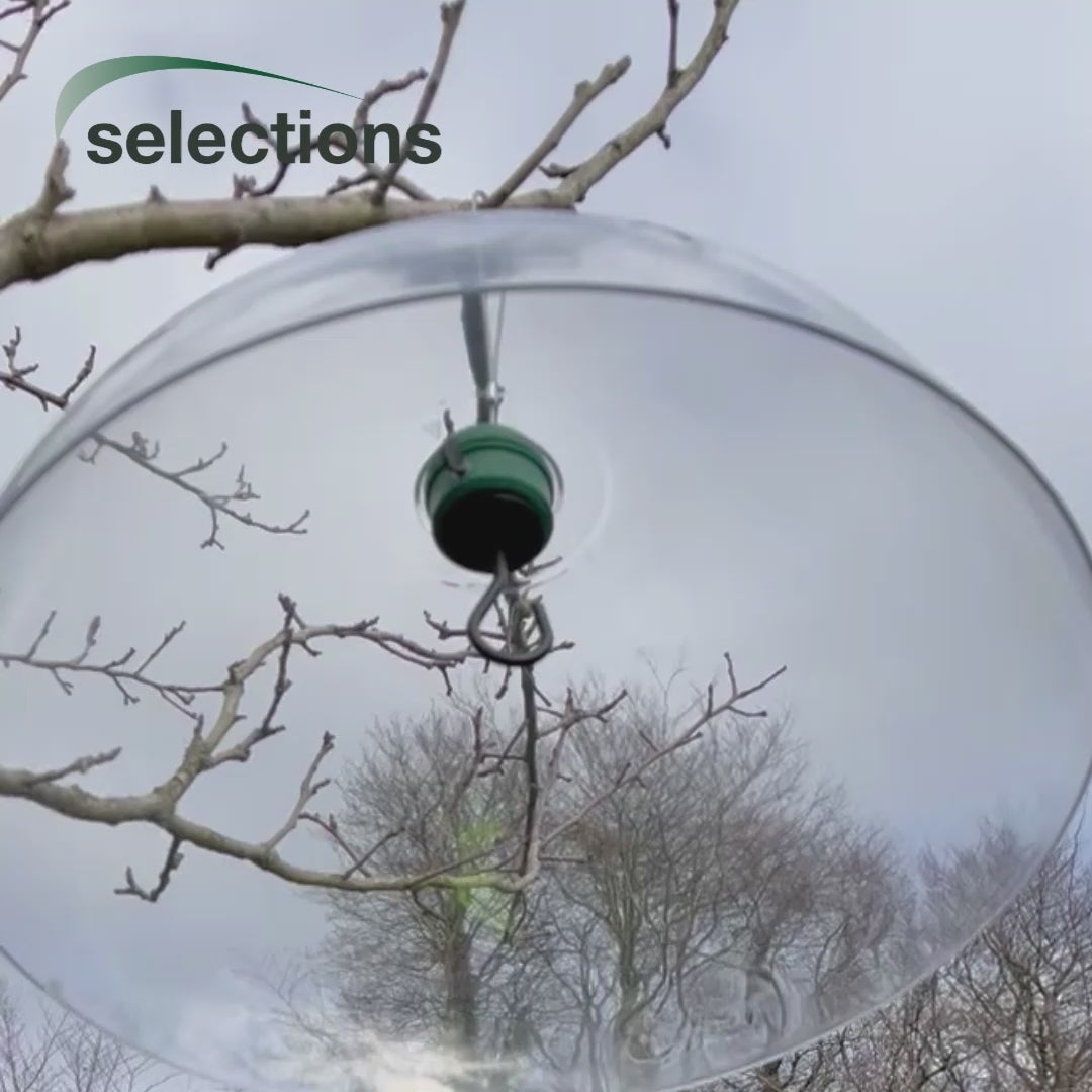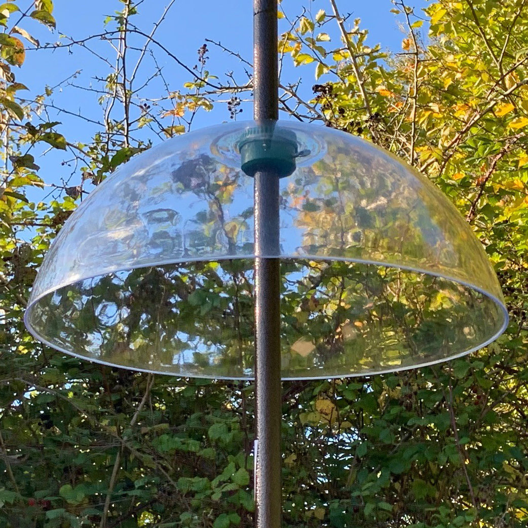 A protective dome, 40cm wide, that has been found to successfully prevent the wily squirrel and other predators from reaching bird food. These super smooth, slippery domes can either be attached to the poles of bird feeding stations or used with the supplied hanging hook to suspend a feeder below.
