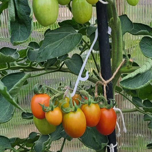 These tomato plant support J hooks are simple, yet ingenious - the larger hooked end of the clip sits around the main stem of your tomato plant, whilst the double-hooked end then grabs the thinner stems that the tomatoes grow from, helping keep them from falling or breaking. As your fruit matures, the heavier it becomes and these clips help take the load. These can also be used to train your plants from above, allowing them to grow up instead of out.
