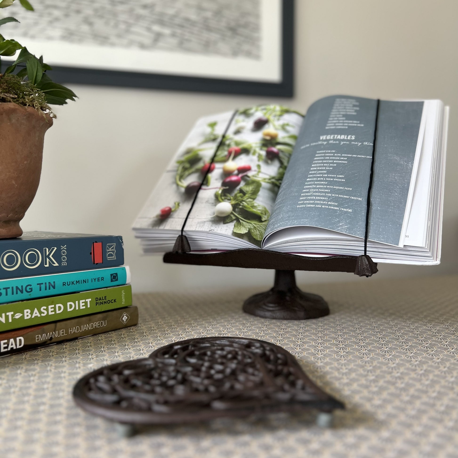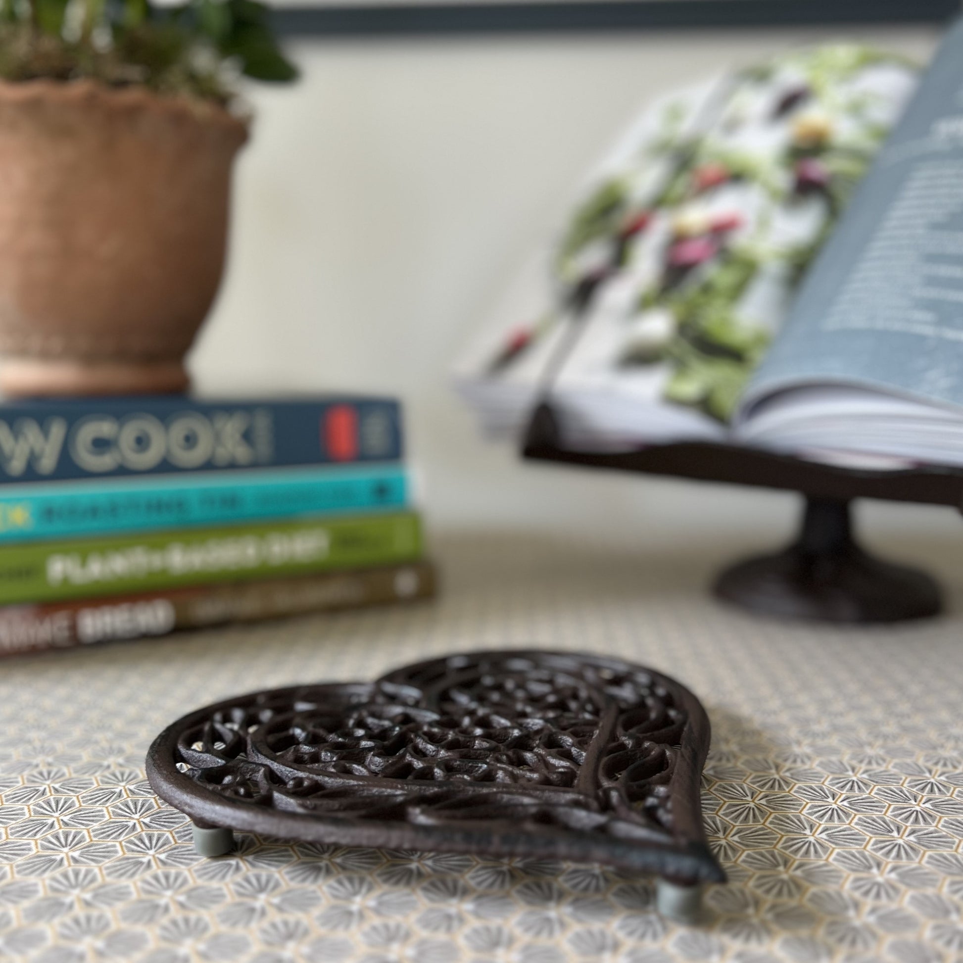 Cast Iron Ornate Cookbook Stand & Heart Trivet Kitchen Set