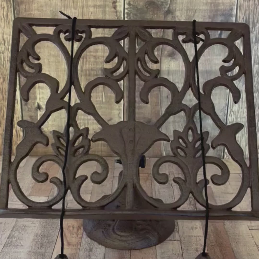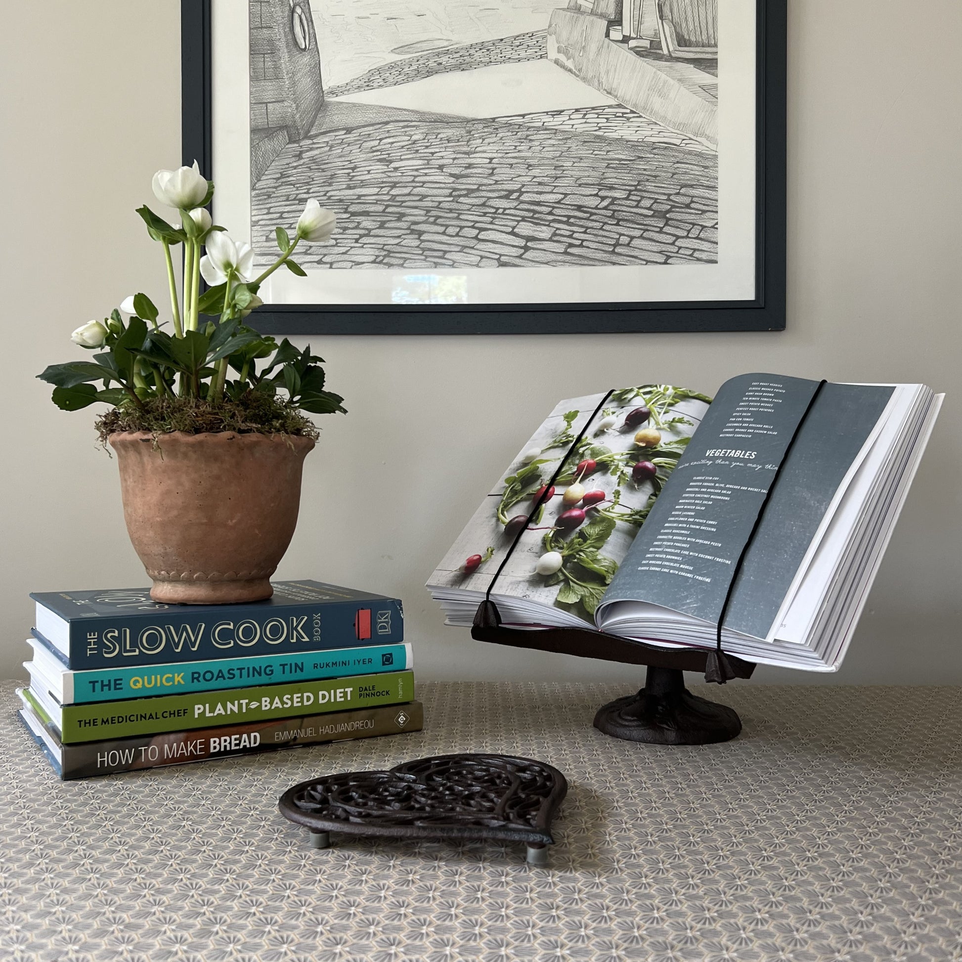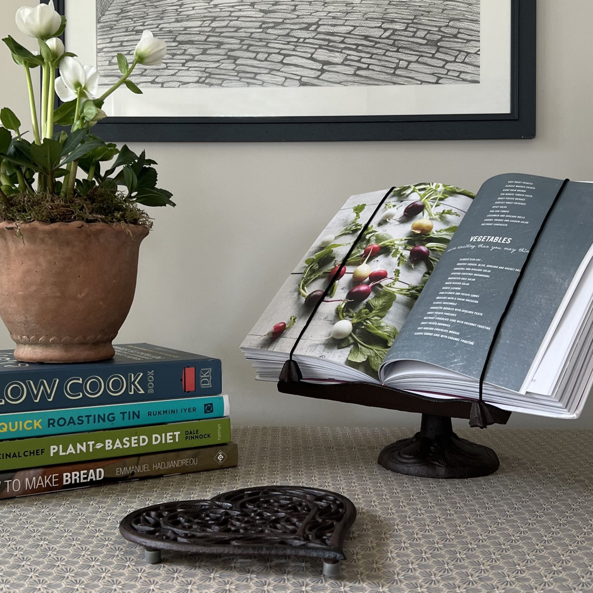 This traditional style cookbook holder is crafted from cast iron. It features a solid base for stability and hanging weights to keep the pages from flicking shut. The trivet, also cast iron, is beautiful and decorative, and has the added function of protecting your surfaces from hot pots and pans. The trivet measures 18cm x 18cm.