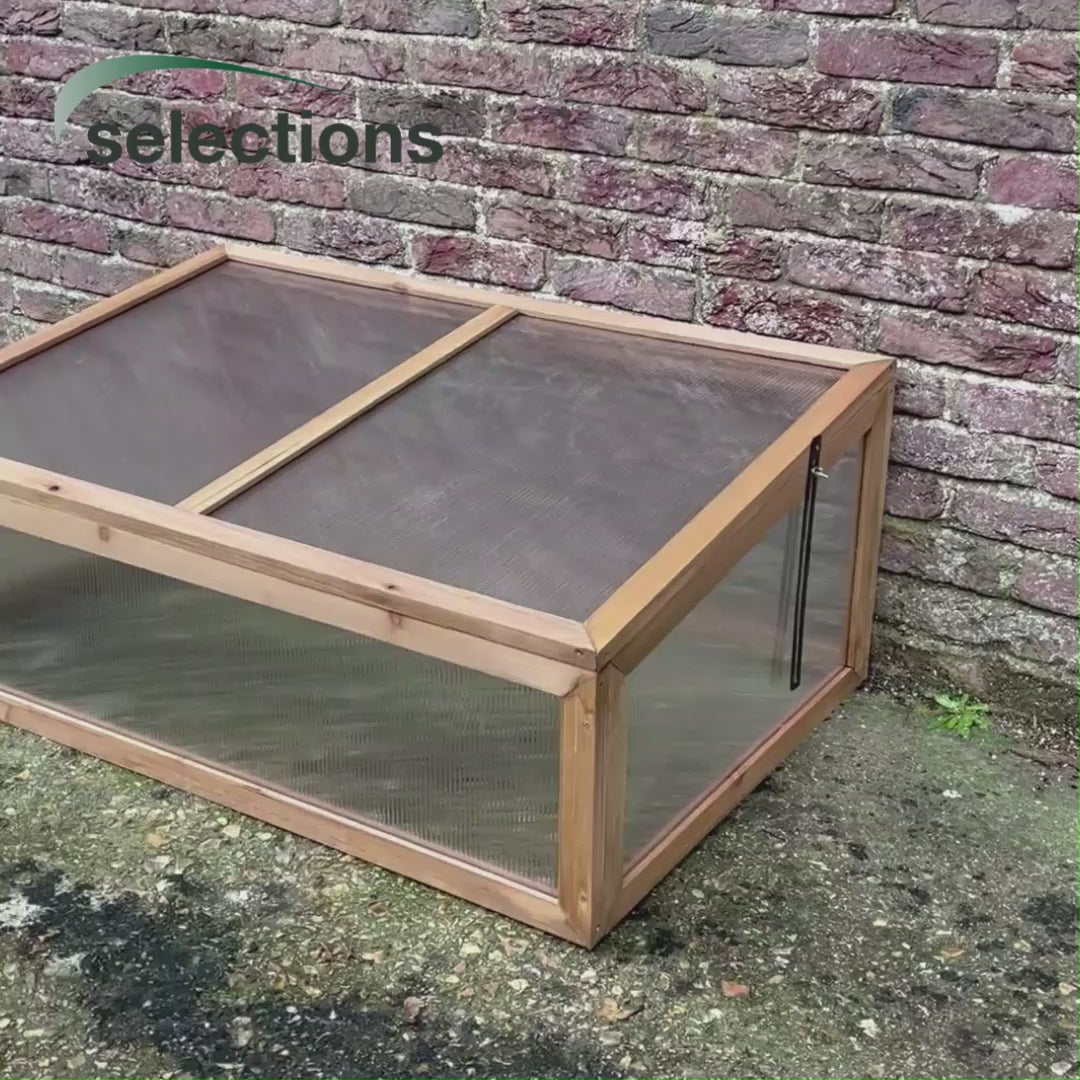 Made from a stained wood frame with twin walled polycarbonate sheets, the coldframe comes flat packed and required home assembly. It has a hinged opening top for easy access to plants and has no base so that water can drain freely when the contents are irrigated.