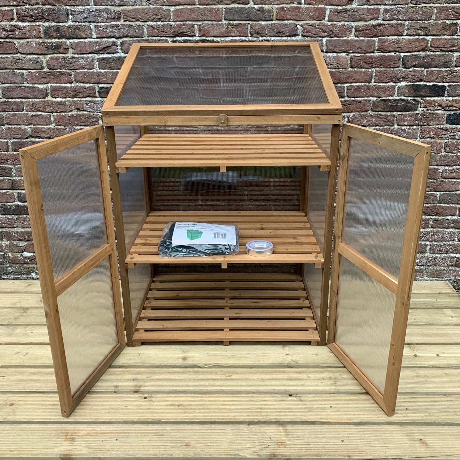 Made from a stained wood frame with twin walled polycarbonate sheets, the cold frame comes flat packed and requires home assembly. There are 3 shelves, a hinged opening top and 2 opening doors with a fastener to keep them firmly shut when required.