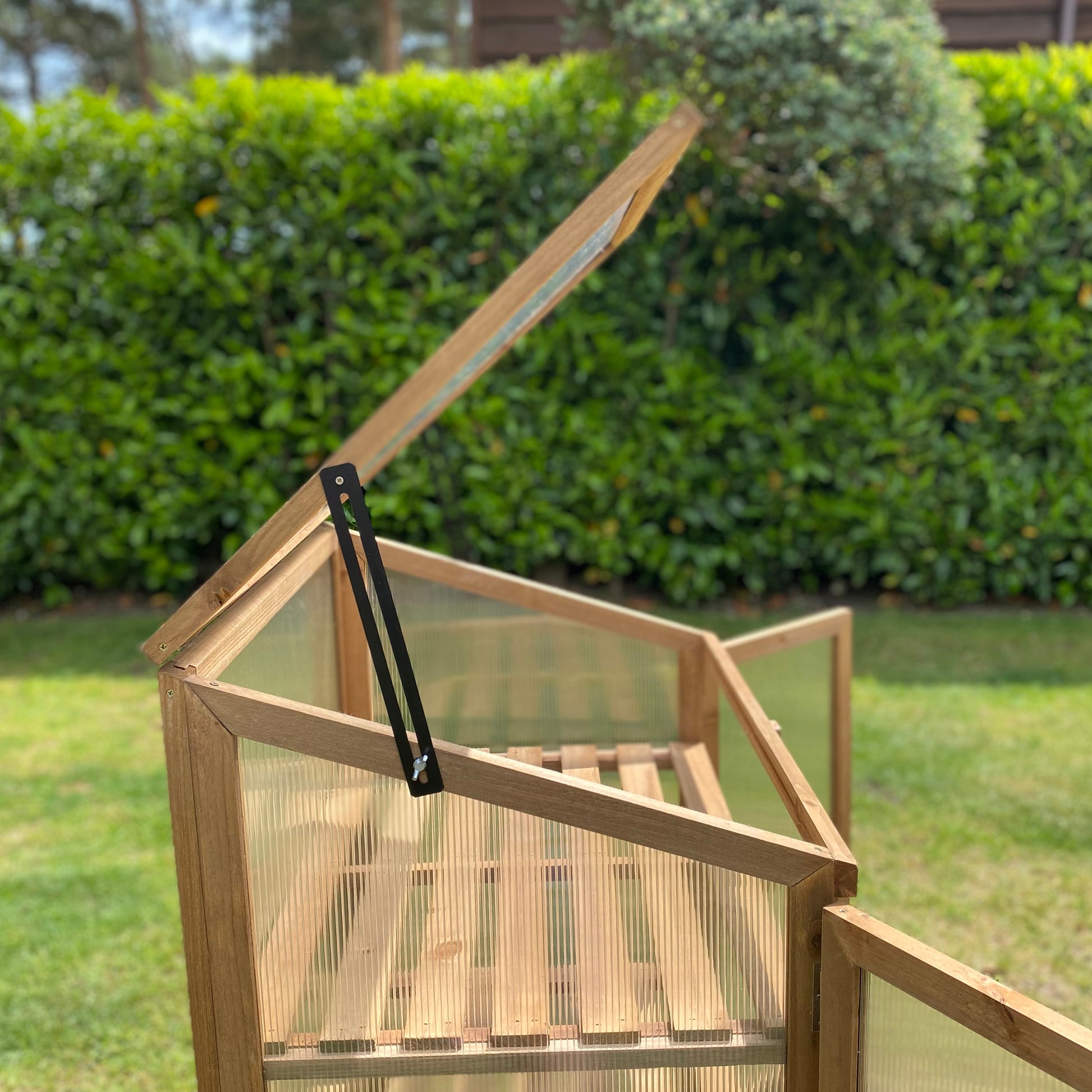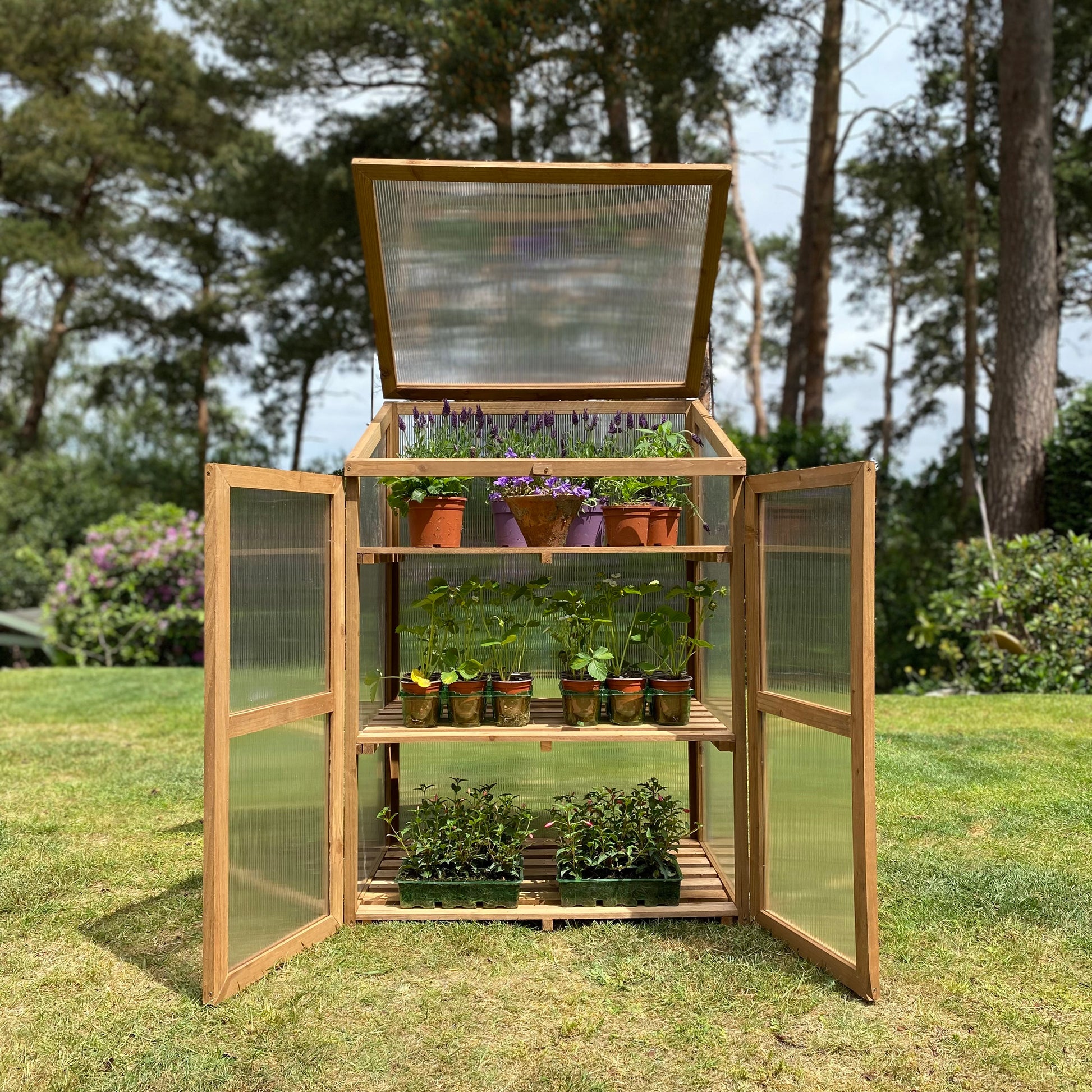 Made from a stained wood frame with twin walled polycarbonate sheets, the cold frame comes flat packed and requires home assembly. There are 3 shelves, a hinged opening top and 2 opening doors with a fastener to keep them firmly shut when required. This plant growhouse offers exceptional value.