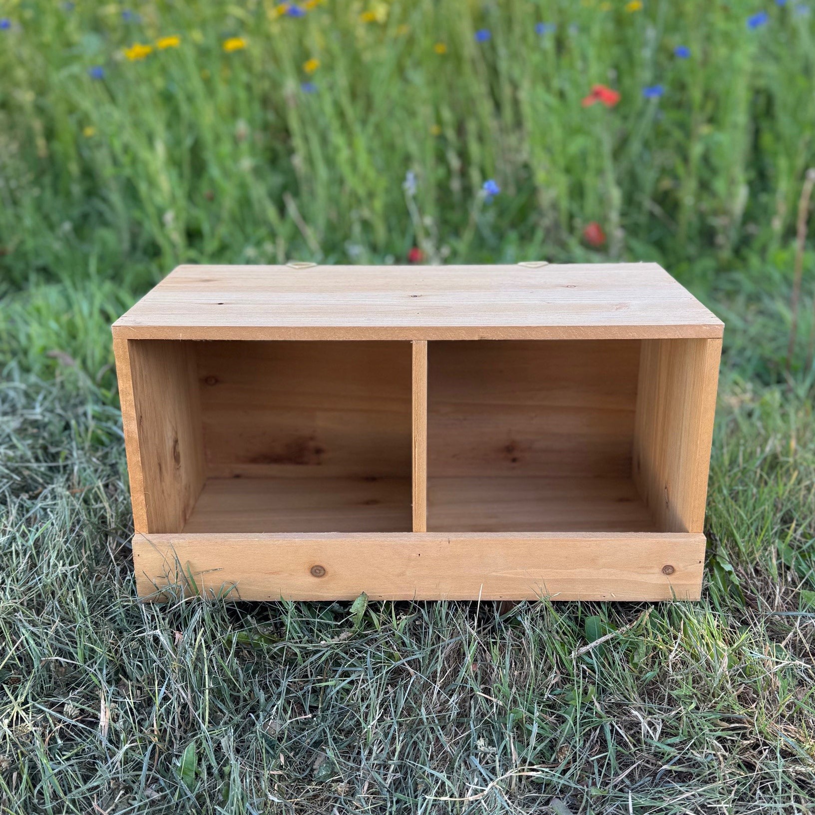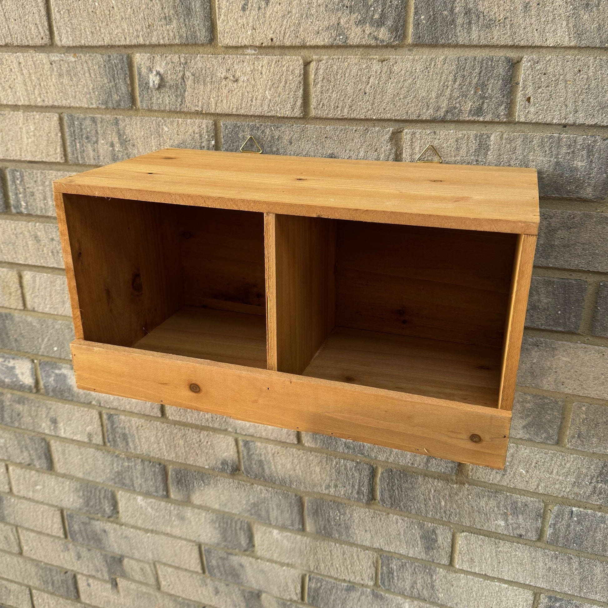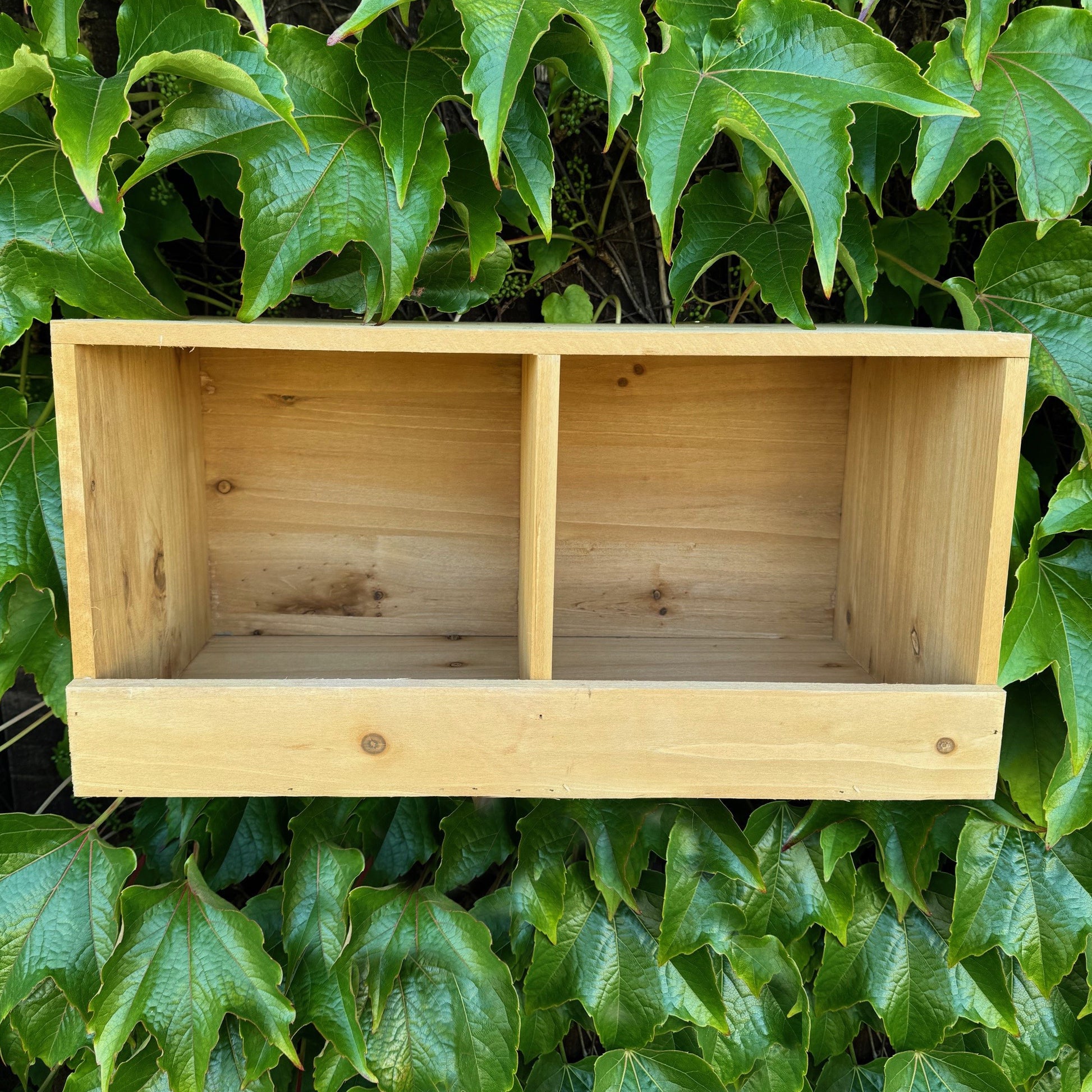 The box measures 22cm x 22cm x 44cm and the dual openings are each 20cm wide by 15cm high. The thickness of the wood is 1cm, offering good insulation, and two metal hanging hoops are affixed to the back of the box.