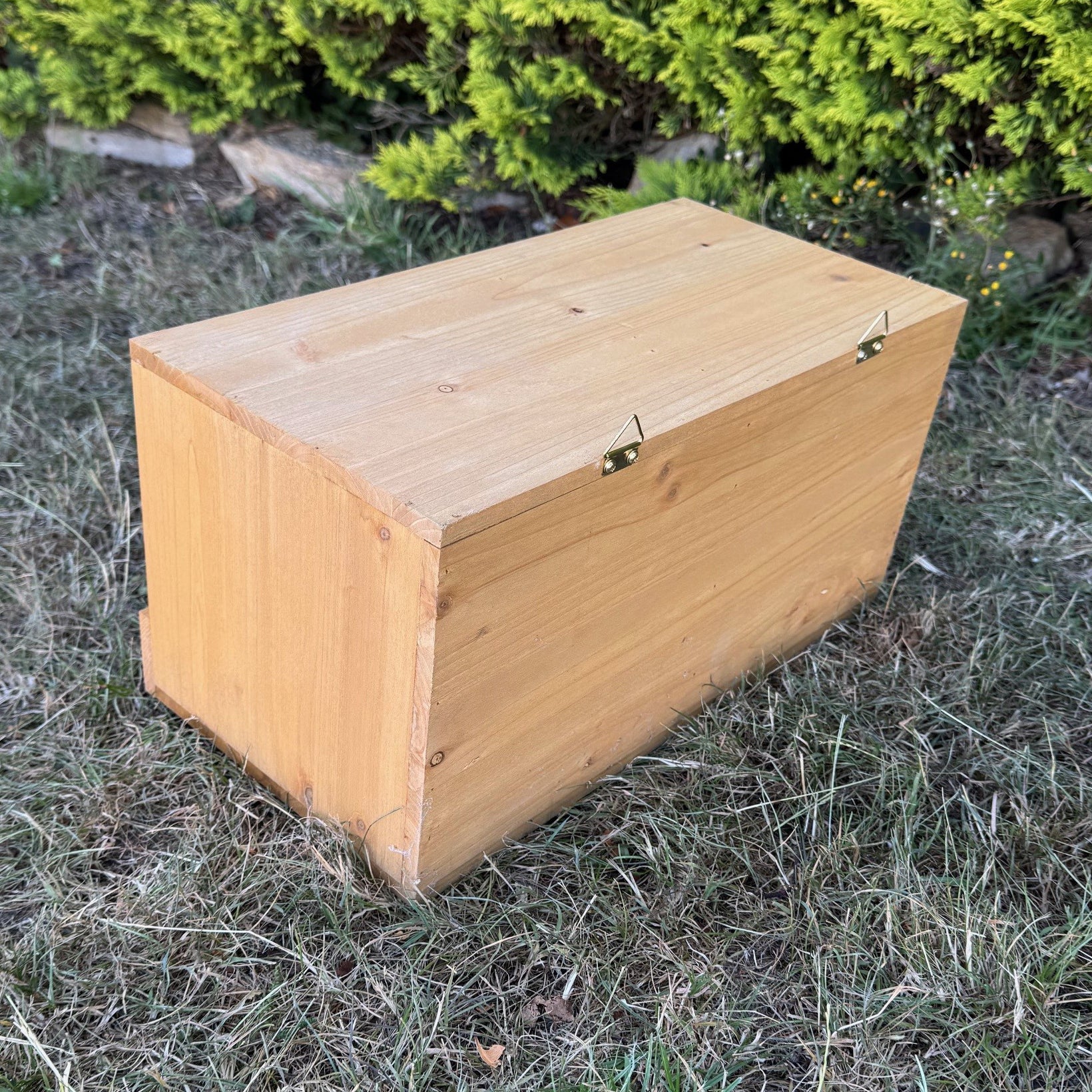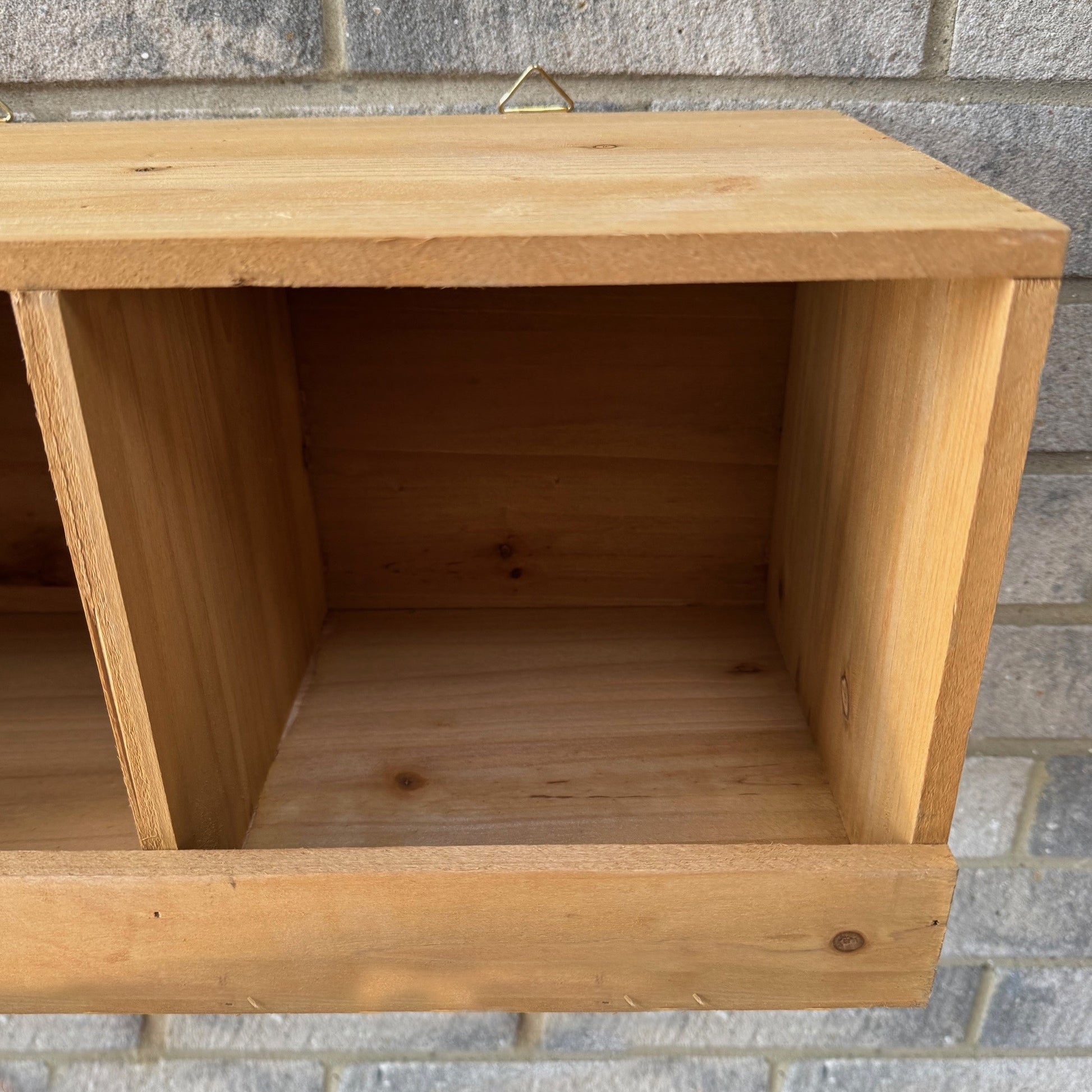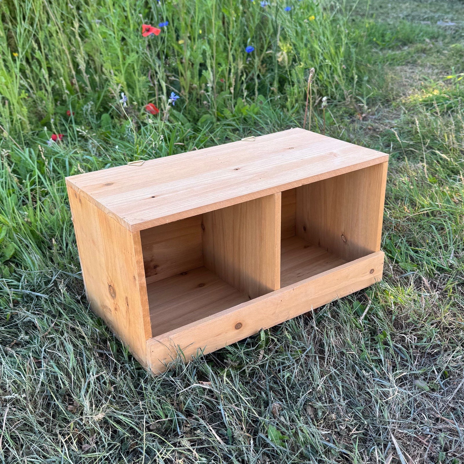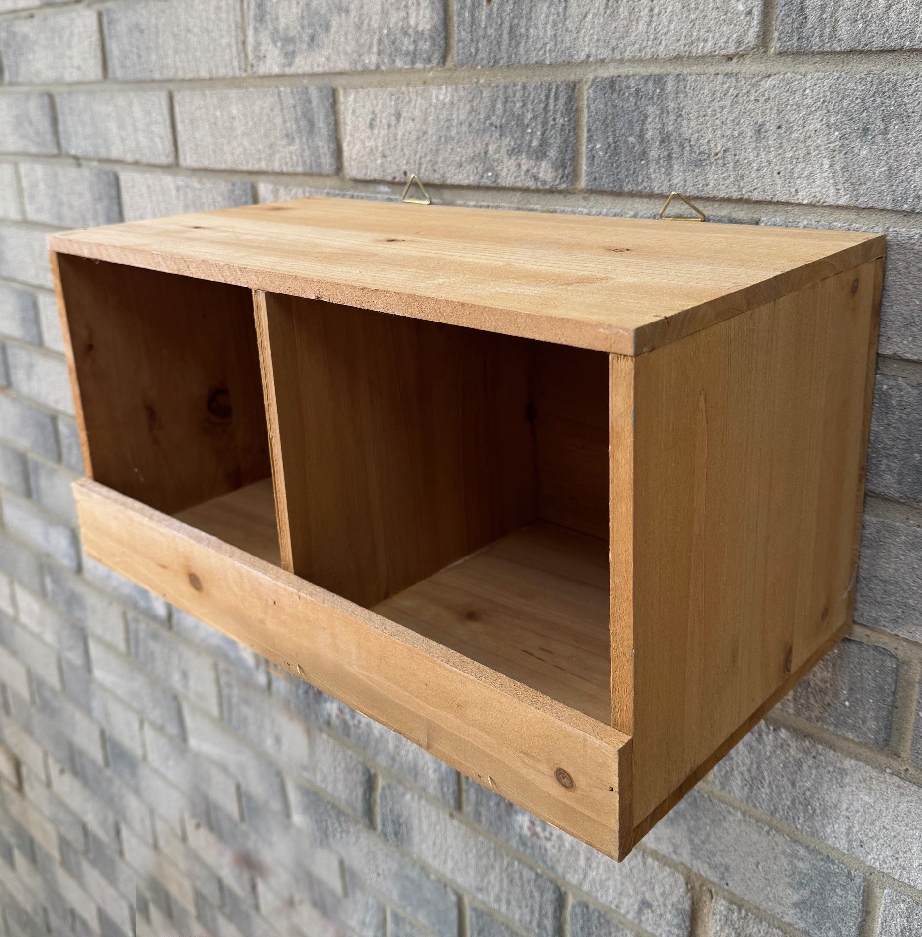 The box measures 22cm x 22cm x 44cm and the dual openings are each 20cm wide by 15cm high. The thickness of the wood is 1cm, offering good insulation, and two metal hanging hoops are affixed to the back of the box.