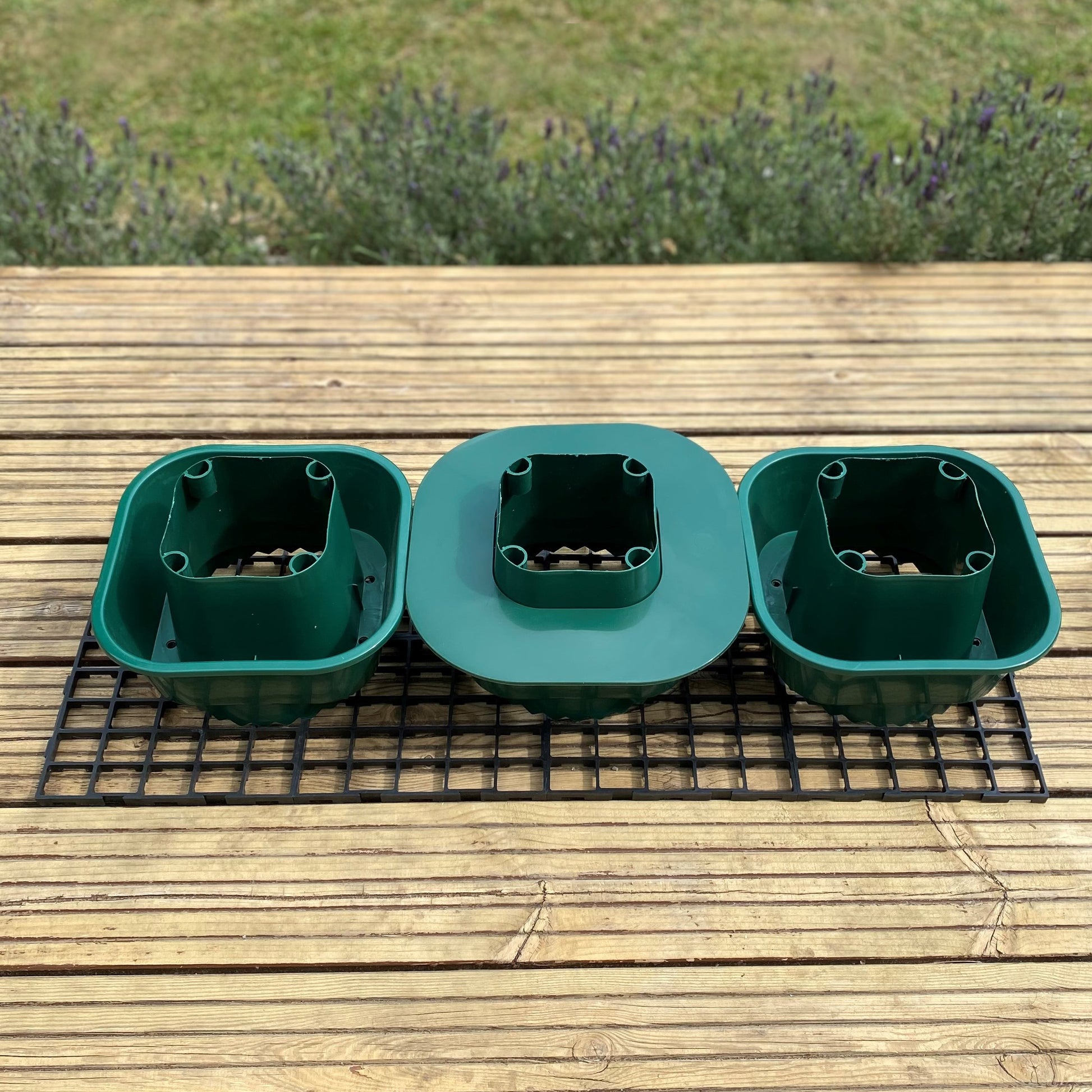 An ingenious yet simple design, the growbag pot has a serrated base that cuts neatly into the bag of compost, with three pots fitting the standard bag comfortably. The pots have an outer trough that holds four pints of water or feed which then gradually seeps into the compost taking a constant supply directly to the plant root where it is needed most. The plant is sited in the inner pot, which is then filled up with extra compost to encourage more vigorous and healthy root growth and subsequent higher yields.