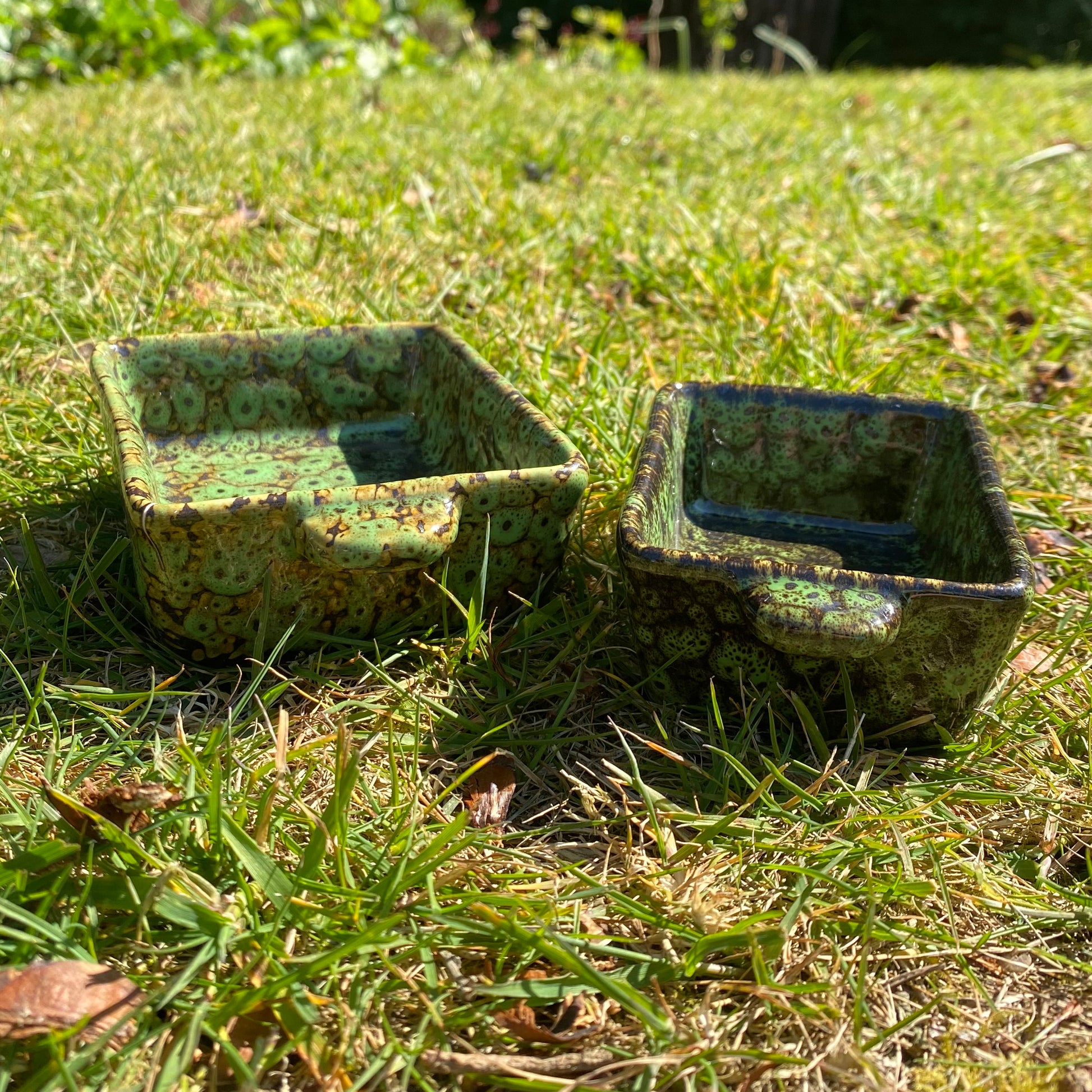 Finished in natural green and brown colours, the ceramic bowls are decorative, practical and easy to clean. The food dish (the larger of the two) measures 14cm x 9cm x 4cm and features a drainage hole in the base, whilst the water dish measures 12cm x 7cm x 4cm and is solid. A pack of dry nesting straw completes the set.