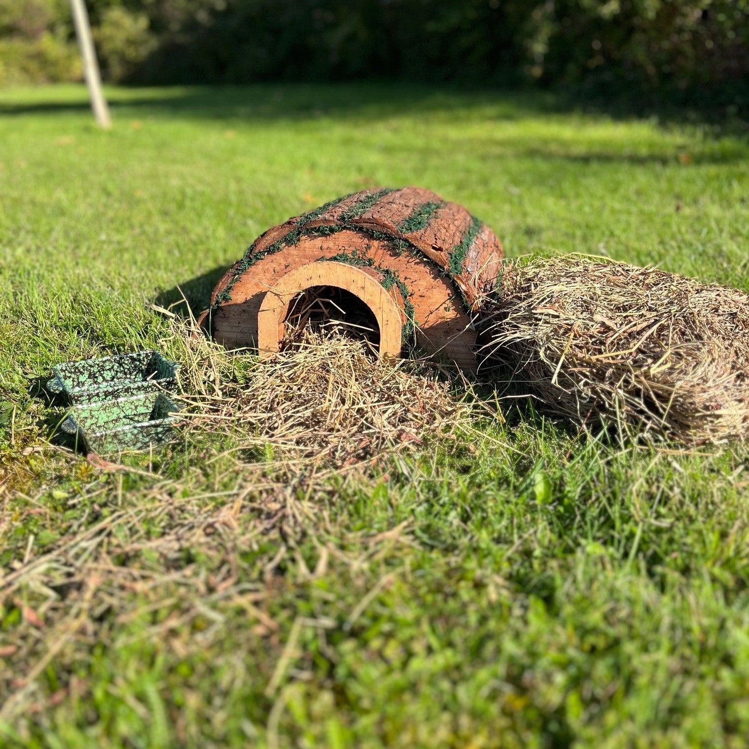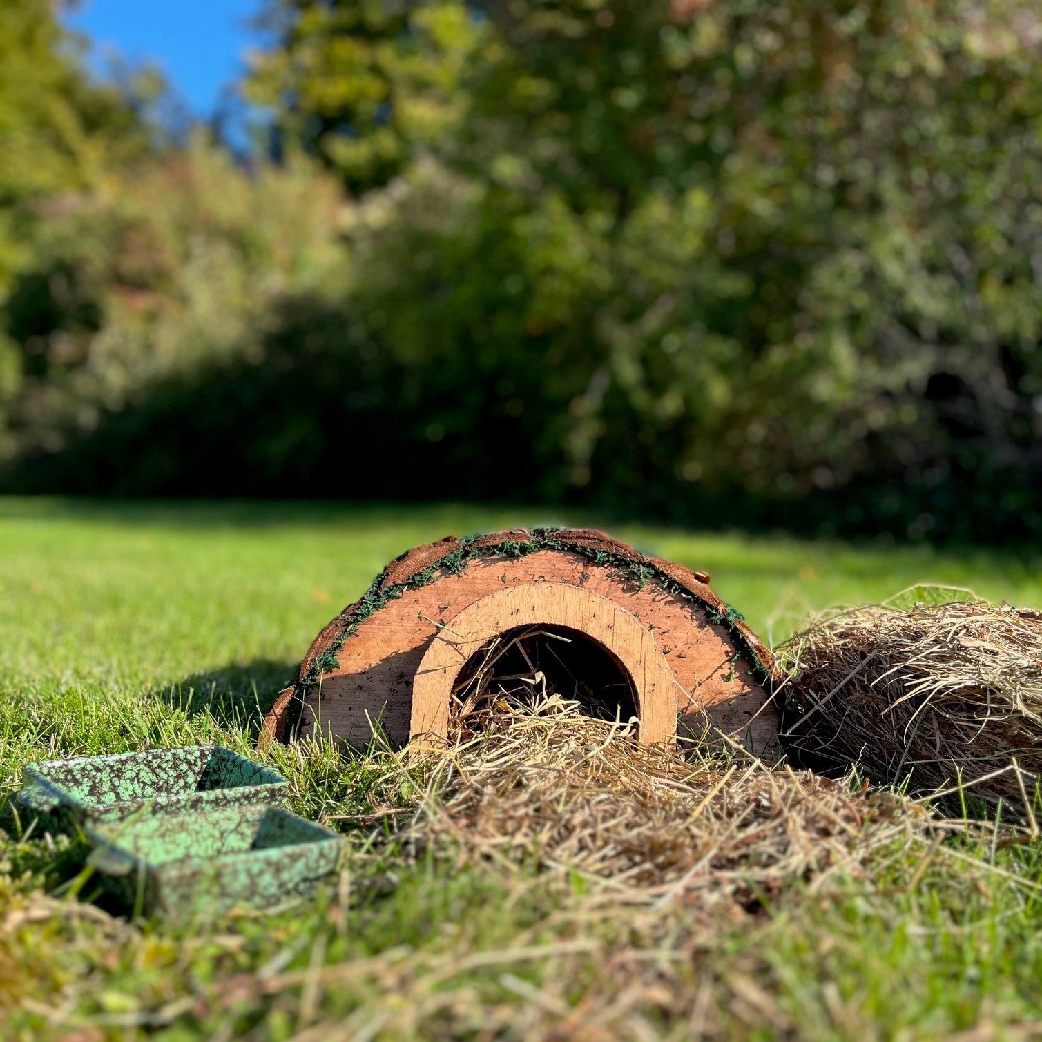 Wooden Barkwood Hedgehog House With Ceramic Food & Water Dish Set & Nesting Straw